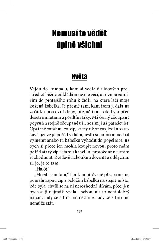 Napadlo vás někdy, co řeší milenka ženatého muže a jaká je ve skutečnosti ta příšerná manželka, o které jí on vypráví? Nebo proč má sestra manželky tak špatný vztah se svojí dcerou? Jak se vlastně cítí ta patnáctiletá holka, na kterou si rodiče nikdy neudělají čas? A kam se vlastně poděly ty peníze? Kdo je vzal, kdo je ztratil, kdo je utratil, kdo je našel a kdo je bude muset vrátit?