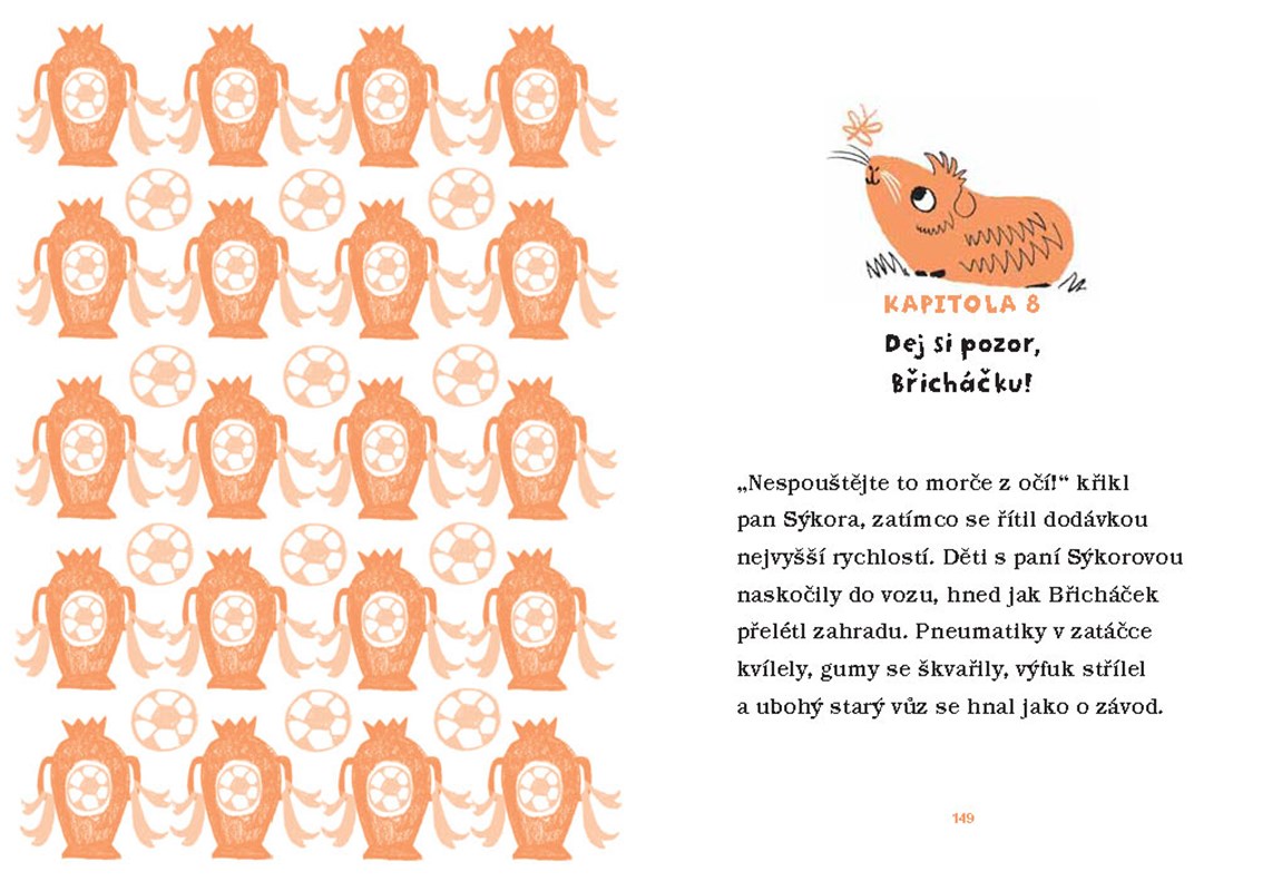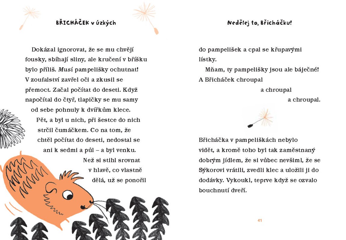 Břicháček je morče jako každé jiné. Nejradši chroupe mrkev nebo pospává ve svém doupátku. Případně si čte články o svém oblíbeném fotbalovém klubu FK Jiskry v novinách, co leží na dně jeho klece. To se však brzy změní… Čeká ho totiž stěhování do nového bytu!