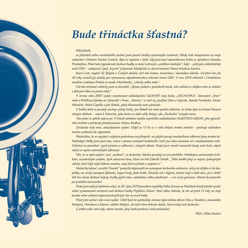 Příznivci poctivé lidovky se konečně dočkali. Po dlouhých třinácti letech vychází z pera Milana Koukala nové a doplněné vydání publikace, která mapuje historii i současnost naší dechové hudby. Seznámíte se s kořeny dechovky i s nejvýznamnějšími osobnostmi - se skladateli, textaři, muzikanty, kapelami… Vždyť naše česká a moravská dechovka je pojem i ve světě. Kdo by neznal Kmocha, Hašlera, Vejvodu, Slabáka, Pavluše, Moravanku, Mistříňanku, Standu Procházku, Milana Černohouze a další velikány tohoto hudebního žánru? Kniha vás v rytmu polky a valčíku provede minulostí i přítomností, ať už formou popisnou či mnoha krásných rozhovorů s hlavními postavami dechové hudby. V publikaci rovněž naleznete unikátní seznam 1 000 aktivních kapel a pro poslech nechybí přiložené CD z dílny skvělé Veselky Ladislava Kubeše.