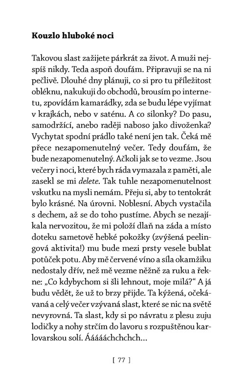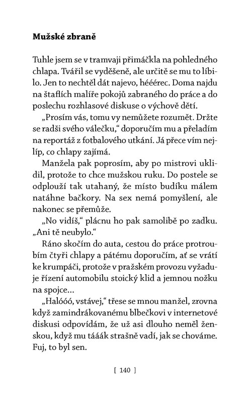Vstupte do světa autorky vtipných sloupků, na kterou povinnosti stojí frontu, ale ona už moc dobře ví, jak v tom plavat a na koho co hodit. Ostře nabroušené texty vás nejen pobaví, ale také inspirují k tomu, abyste ovládly všech osm zbraní zkušené ženy: grácii dámy, cynismus manželky, oddanost dcery, píli hospodyňky, nadhled matky, sebevědomí femme fatale, urputnost kazatelky i nevypočitatelnost kalamity. A svět vám bude ležet u lodiček!