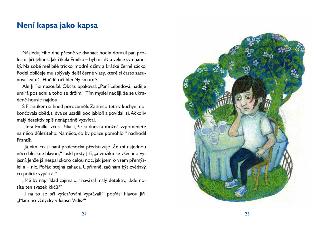 Znáte malého detektiva? Jmenuje se Frantík Lebeda a má už tři úspěšně vyřešené případy. Pravda, nebyl na ně sám, pomohli mu nejlepší kamarádi Matěj a Zdíša, nechyběl ani vlčáček Kazan. Tak jako v pátrání po drahých houslích. Ty se totiž ztratily v základní umělecké škole, kde učí i Frantíkova tetička hru na klavír. Milou tetičku Emilku v strašlivém podezření přece nemůže malý detektiv nechat. A on už má velké tušení, takže, kamarádi, jdeme na to!