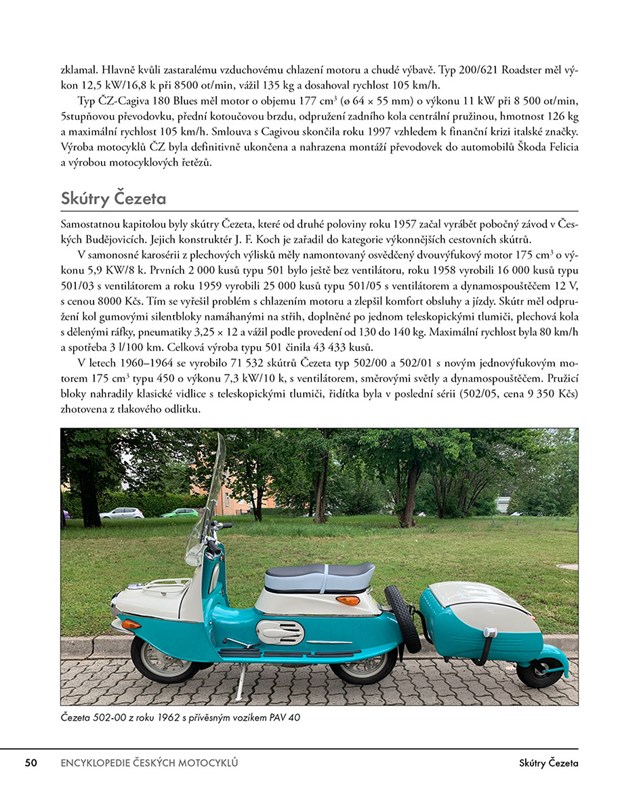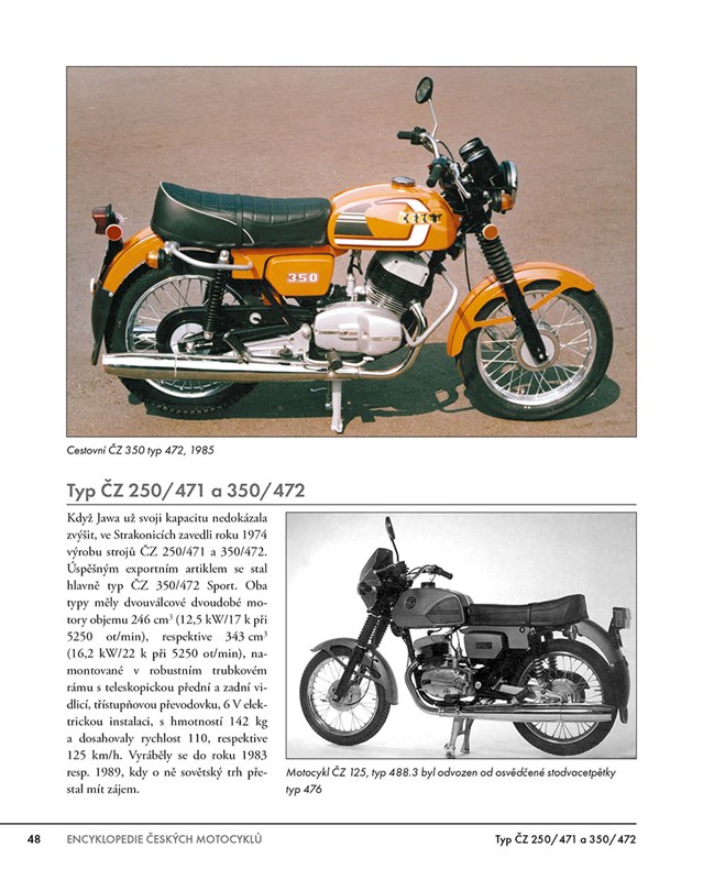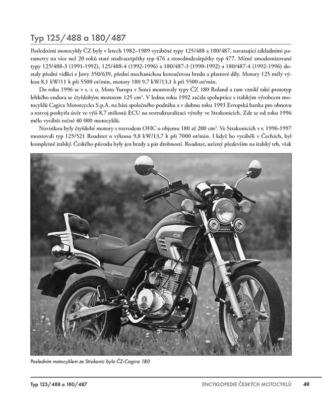 Encyklopedie motocyklů přehledně popisuje více než stoleté období výroby jednostopých motorových vozidel na území Česka a Slovenska – a to od roku 1899, kdy byl na trh uveden první motocykl Laurin&Klement, až po současnost. Kniha obsahuje přehledný výčet několika stovek malých i velkých výrobců motocyklů včetně technického popisu, fotografií, počtu vyrobených strojů a zajímavostí z konstrukce jednotlivých motocyklů.