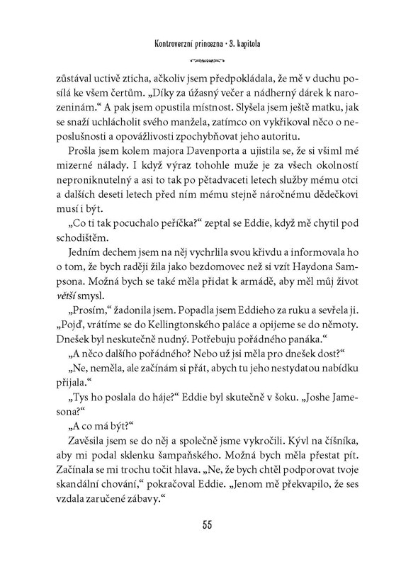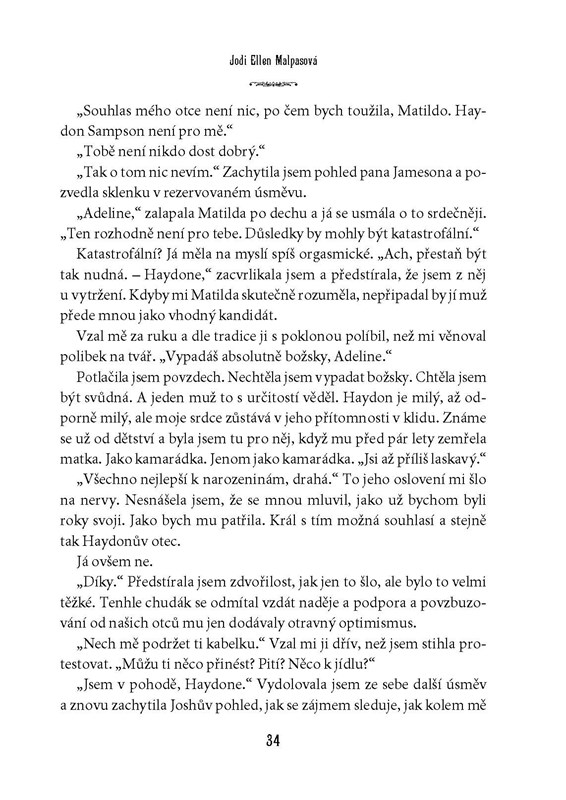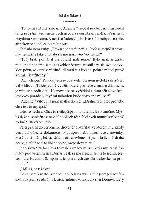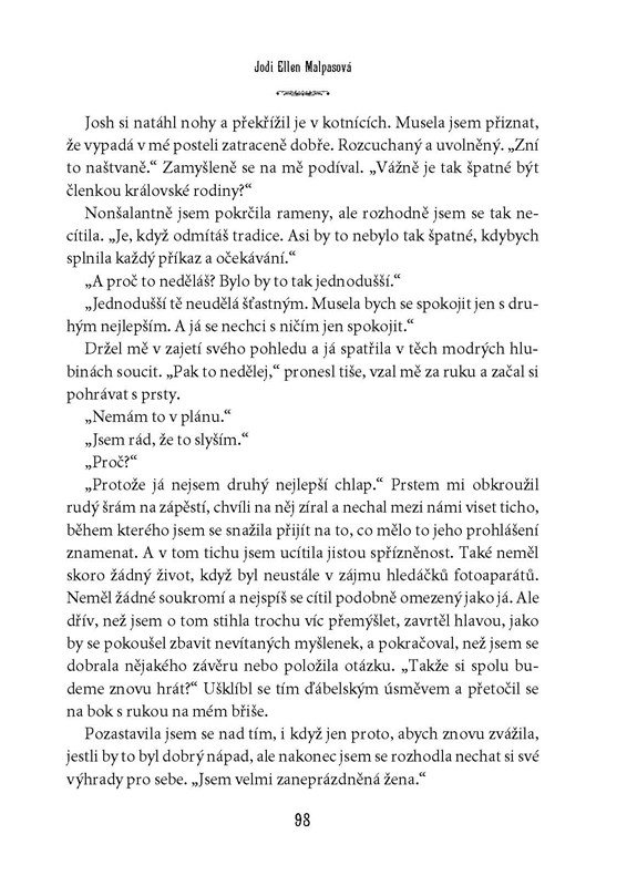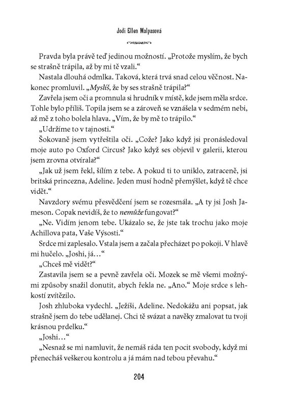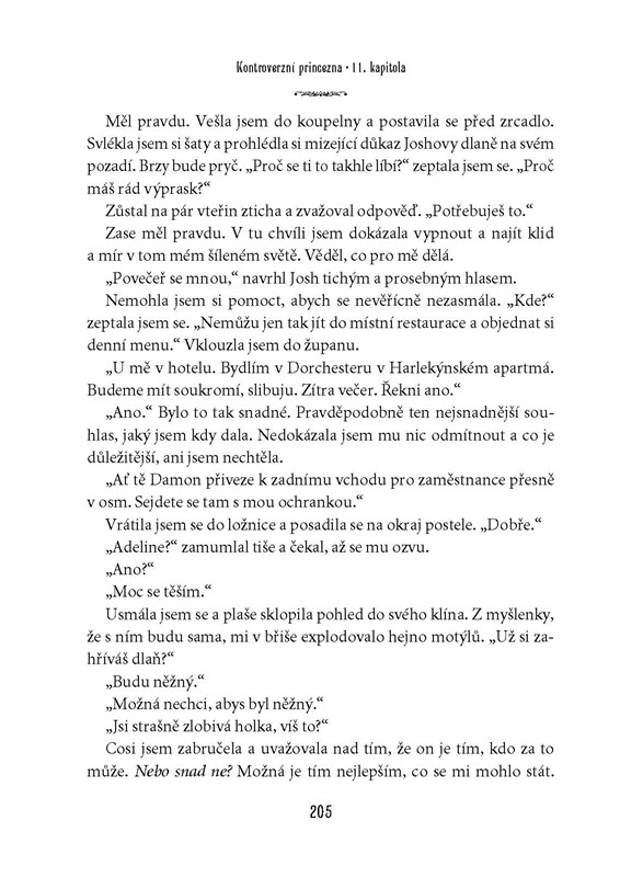 Být členkou královské rodiny je pro někoho splněný sen. Život moderní princezny Adeline má ovšem do pohádky poměrně daleko. Odmalička ji pronásledují novináři, veřejnost hlídá každý její pohyb i slovo a ona už má zavedených konvencí plné zuby. Bouří se a odmítá se provdat za muže, kterého nemiluje. Navzdory odhodlání zachovat si svobodnou vůli a žít jako normální člověk však cítí, jak ji zlatá klec královského paláce pomalu dusí… Plamen vášně v ní rozhoří až milostný poměr s Joshem Jamesonem, jedním z nejatraktivnějších herců Hollywoodu – s ním se Adeline cítí živá jako nikdy předtím. Půjde jen o další skandální románek, nebo má vztah krásné princezny a sexy filmové hvězdy naději na „něco víc“? A bude s ním souhlasit král? Adeline se zamiluje, zároveň ale ví, že poradci jejího otce udělají vše pro to, aby její lásku zničili…
