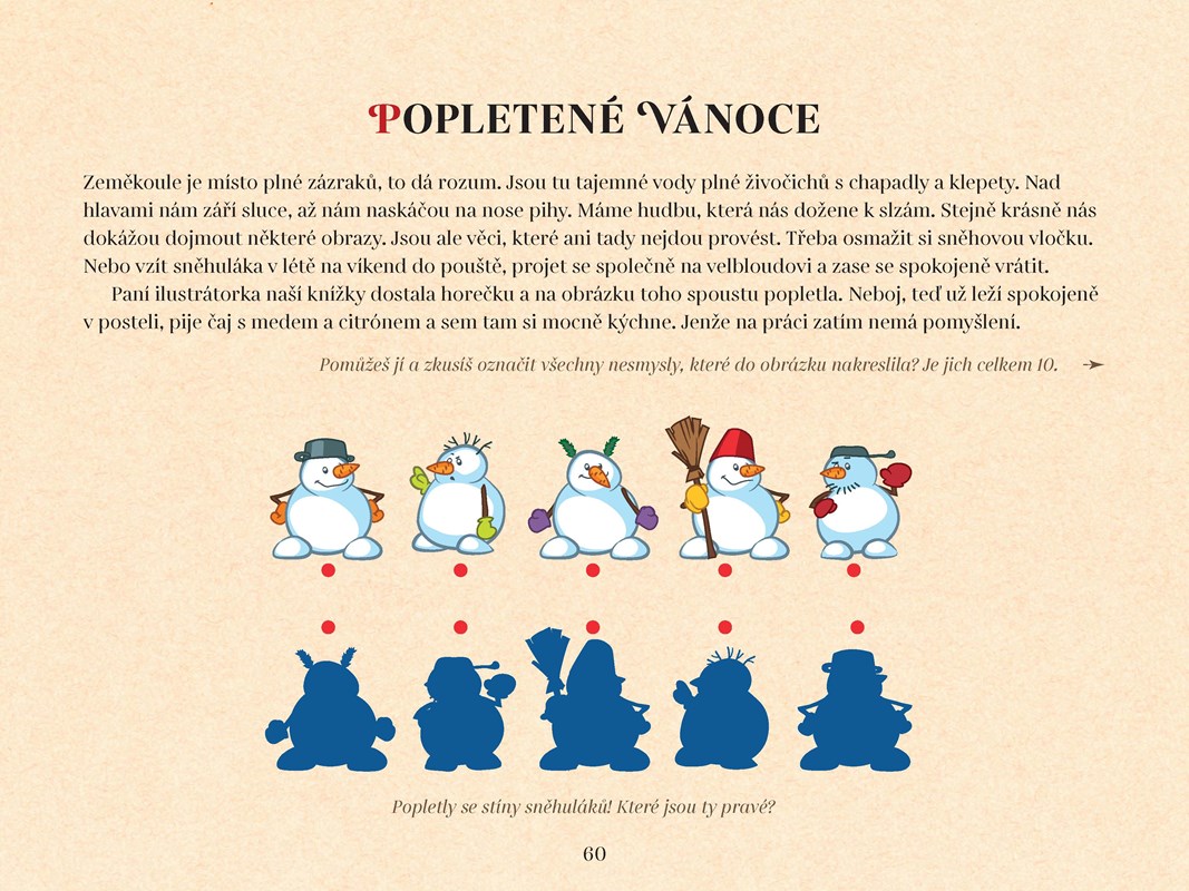 Oblíbené hry ve zpracování předních výtvarníků, které si menší i větší děti již několik hrají na webu českotelevizního Déčka, si nyní vyzkouší v naší knize. Jak? Vždyť do knih se čmárat nemá! Pomocí kouzelné fólie! Stačí obyčejná lihová fixa a jde se na to! Adventní knížka též děti provede čtyřmi adventními týdny, tedy železnou, bronzovou, stříbrnou a zlatou nedělí, které představují čtyři svíčky na adventním věnci. Slovo advent všichni znají, hlavně z čokoládových kalendářů, ale jaká tajemství a dobrodružství vlastně skrývá? Víte, že dárky nenaděluje jen Ježíšek nebo Santa Claus, ale třeba také Babbo Natale či vánoční skřítci? Vypravte se za nimi prostřednictvím naší knížky. Ta je totiž báječná, můžete si v ní hrát jako na webu Déčka, ale navíc se dovíte mnoho zajímavého!