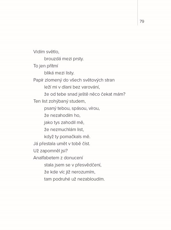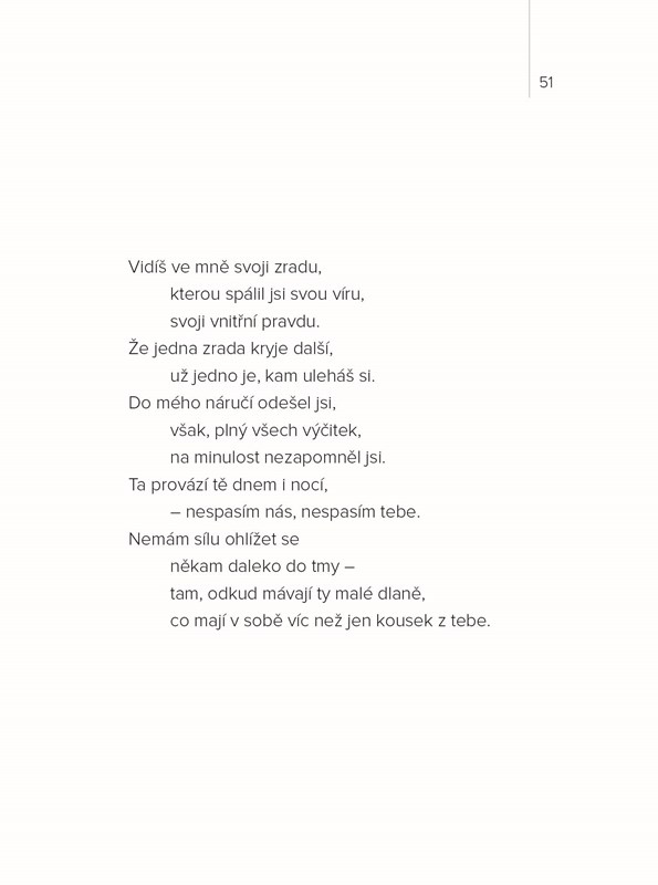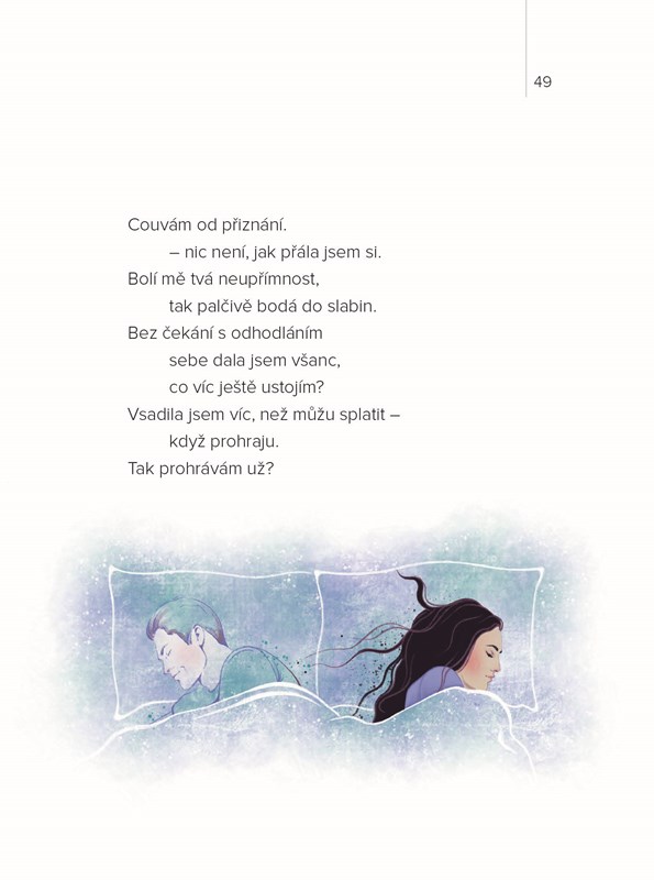 Ve verších ukrytý příběh o boji se zakázanou láskou, o zradě, slibech, odpovědnosti i strachu. O tom, jak hledání sebe samé prostřednictvím mužské náruče může zraňovat i spalovat neutišitelnou touhou. Obzvlášť pokud ta náruč patří zadanému muži.
