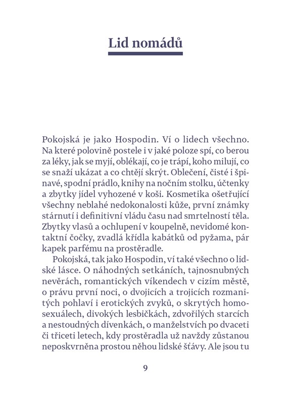 Cestování, konzumerismus turistického ruchu, Babylon západního světa, v němž se míchají nejrůznější kultury a etnika. Minulé století, které dramaticky zasáhlo do osudu mnoha rodin prostřednictvím politických zvratů a nucené emigrace. A novodobé nomádství digitální, spirituální či vztahové, které je odrazem „tekuté přítomnosti“ člověka 21. století, bez hlubších kořenů, bez vymezených hodnot. Román Lid nomádů nahlíží téma cest a cestování z různých úhlů – prostřednictvím vyprávění lidských příběhů, mytologie, historie vztahu člověka a krajiny, deníkových záznamů z cest. Sleduje příběhy několika lidí, kteří jsou dočasně nebo trvale na cestě. Vykročili mimo svou komfortní zónu a vydali se do neznáma, vstříc komickým i fatálním katastrofám.