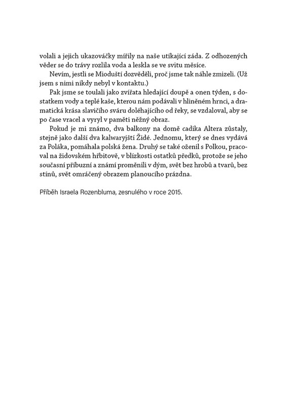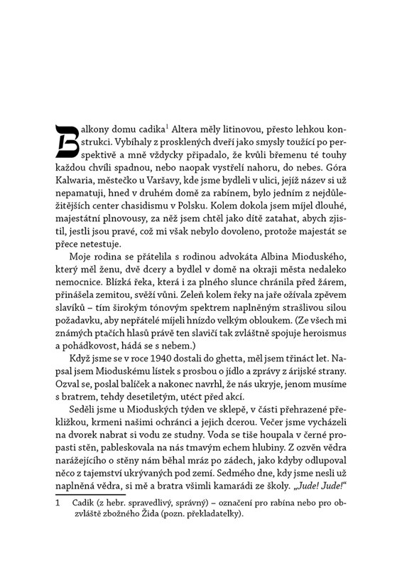 „Před večerem mám ghetto opustit dírou v plotě, pak si stáhnout pásku s Davidovou hvězdou a jít na vlakové nádraží. Při loučení mi Sonia nařizuje jít rychle, neohlížet se, ale já se otáčím a hned pochopím, před čím mě chtěla ochránit. Můj poslední obraz ghetta je budova ozdobená třinácti mrtvolami – toho dne pověsili celý Judenrat.“