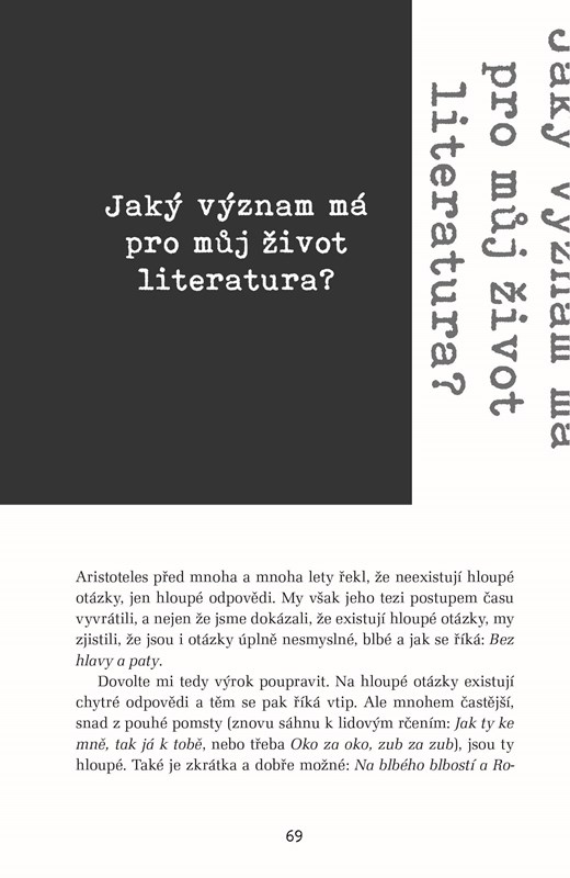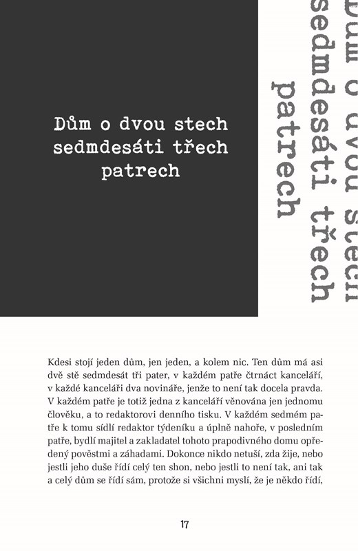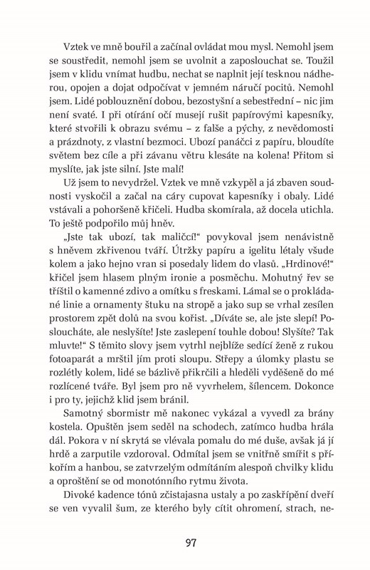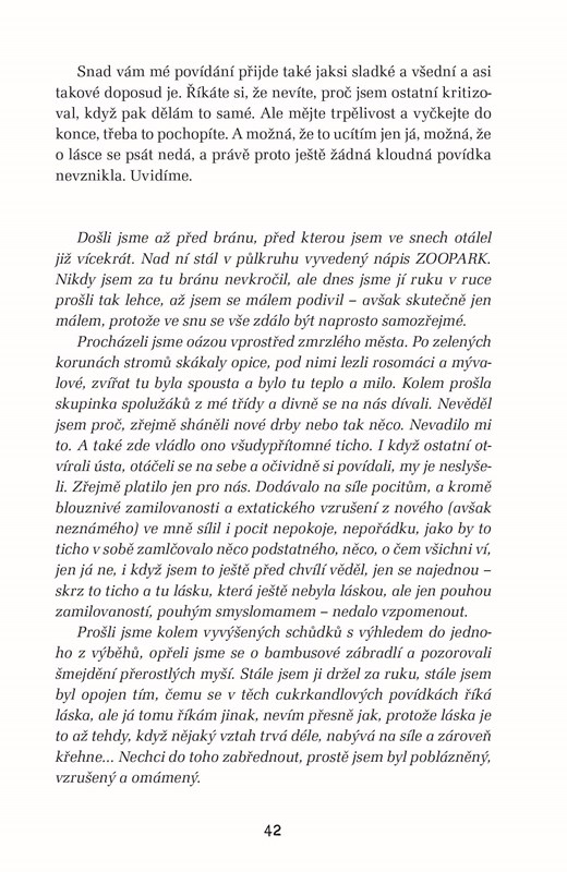 Přesná pozorování, nevšední zamyšlení i osvěžující naivita. Občas specifický humor, občas slzy. A nejedna prazvláštní chvíle v obyčejném světě, který možná není tak špatný, jak se zdá. To všechno se vešlo do čtyřiadvaceti povídek nadějného mladého autora, jehož tvorbu ocenila známá jména české literární a publicistické scény.