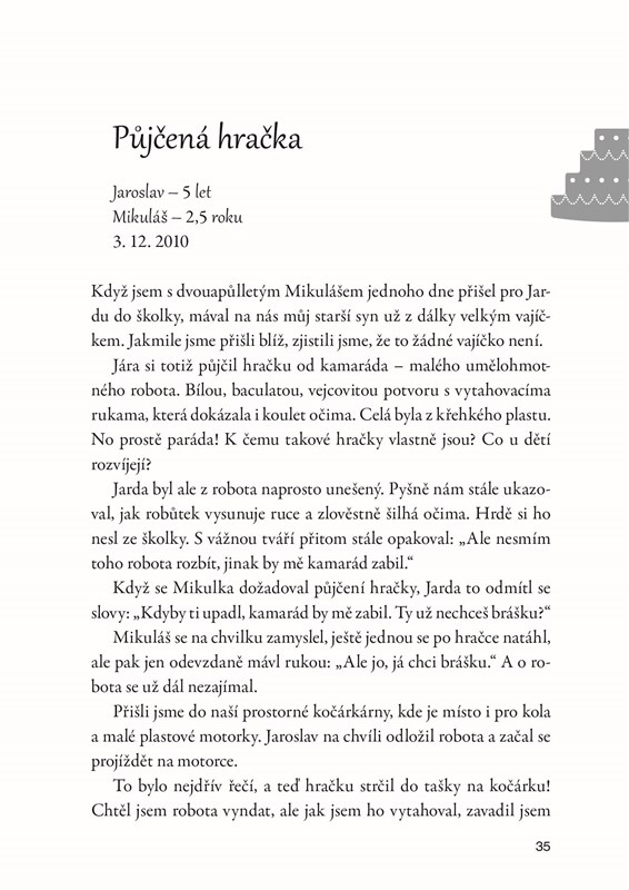Osmadvacet povídek ze života jedné šestičlenné rodiny aneb zlehka unavený otec píše o svých (téměř) neunavitelných dětech. Občas se věci jen trošku zašmodrchají, jindy dojde na pořádné dobrodružství, jako když si autor sám odrodil třetího syna. Pobaví se všichni, maminky poznají výchovu z mužského pohledu a tatínci si třeba řeknou: „Když to zvládá on, já to dám taky.“