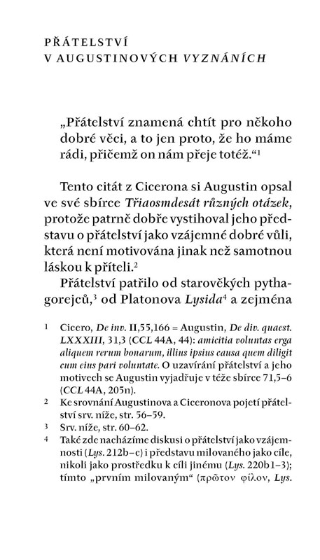 Přátelství patřilo od starověku do oblasti filosofického uvažování. Bylo nejen námětem, ale i prostředím filosofických rozhovorů. Na oba tyto aspekty navázal a ve svých raných dílech je rozvinul jeden z nějvýznamnější myslitelů křesťanského Západu, Aurelius Augustinus. Jeho slavná Vyznání jsou mimo jiné jednou z nejdůležitějších knih o přátelství v evropské kultuře. To, co zde Augustin vypráví o svých přátelích, je především výpověď o něm samém a o Božím působení v jeho i v jejich životech. Proměny Augustinova pojetí přátelství se ve své nové knize rozhodla sledovat znalkyně jeho díla Lenka Karfíková.