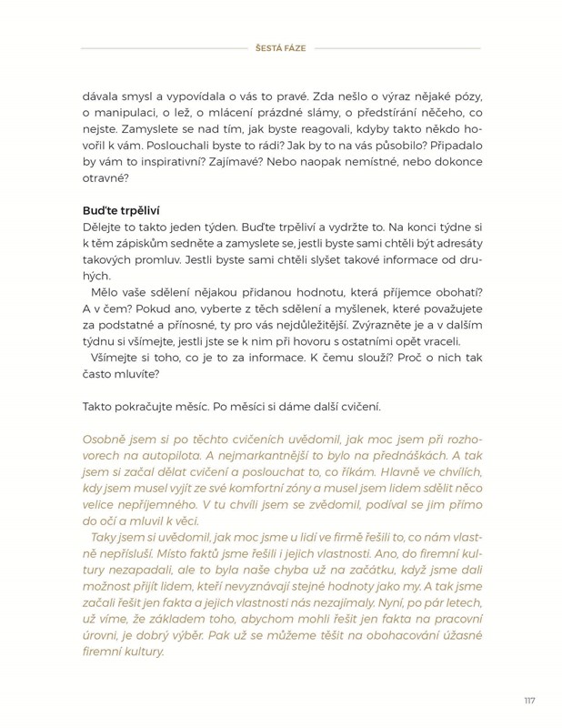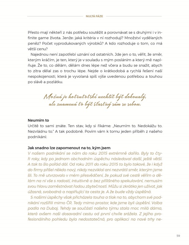Sbírka zamyšlení a zároveň nenásilný „návod na život”. Kniha o budování, o dávání i braní. O pochopení druhých i sebe samých. O bezstarostnosti, ale také o zodpovědnosti, o tom, kdy si z věcí nic nedělat a kdy zase ano. O tom, že bohatství není totéž co hromadění peněz a že osobní růst paradoxně znamená zmenšit se. Kdo to udělá vědomě, snáze najde radost v každodenním konání. A touto cestou může dojít k vyrovnanosti a štěstí.