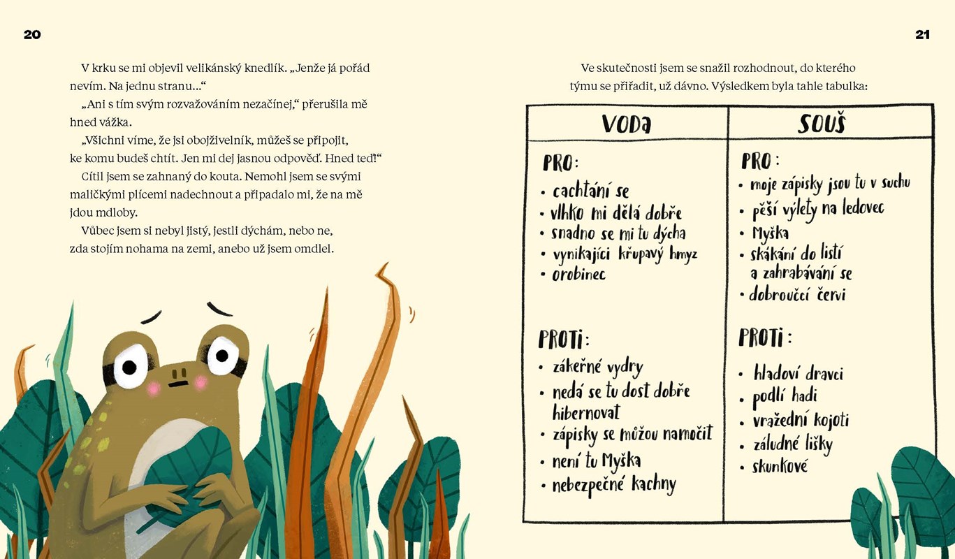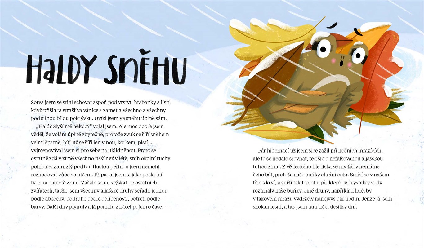 Harold žije u aljašského jezera a je to nesmírně chytrý žabák. Poznáte rozdíl mezi rákosem a orobincem? Harold vám ho hned vysvětlí. Zajímá vás, jakou srst mají jelenci běloocasí? Co nejvíc trápí veverky? Kdo je nejvytrvalejším ptákem Aljašky? Když ale dojde na důležitá rozhodnutí, Harold se rozklepe strachy. Ke kterému týmu v jezerním pólu by se měl přidat? A především – co udělat, aby přežil zimu? Mráz se blíží a Harold se pořád ještě nerozhodl. Nejvyšší čas pořádně zpanikařit! Příběh o zimě, nerozhodnosti a spoustě maličkých, ale nezbytných detailů.