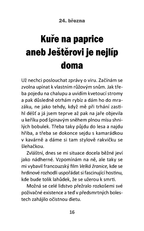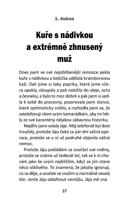 Koronavirová karanténa zastavila kolotoč pracovních povinností také známé moderátorce a spisovatelce Halině Pawlowské. Najednou seděla tři měsíce doma, a tak o tom napsala deník, ze kterého vznikla tato knížka. Jsou v ní veselé povídky o její dceři, zeti, vnukovi, příteli, tchyni, synovi a o situacích, které byly nezapomenutelně trapné. A taky připsala pár receptů a fíglů a návodů, zaručeně ověřených, jak všechno vydržet!