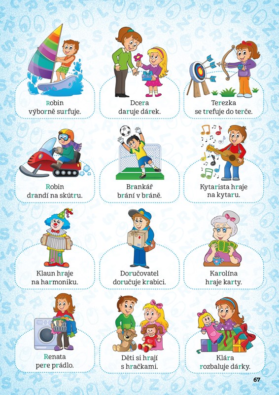* Co kdo dělá – procvičování hlásky zařazené do vět doplněných obrázkem. Věty nejprve opakujte, potom můžete popsat obrázky a povídat si o zkušenostech s danou činností