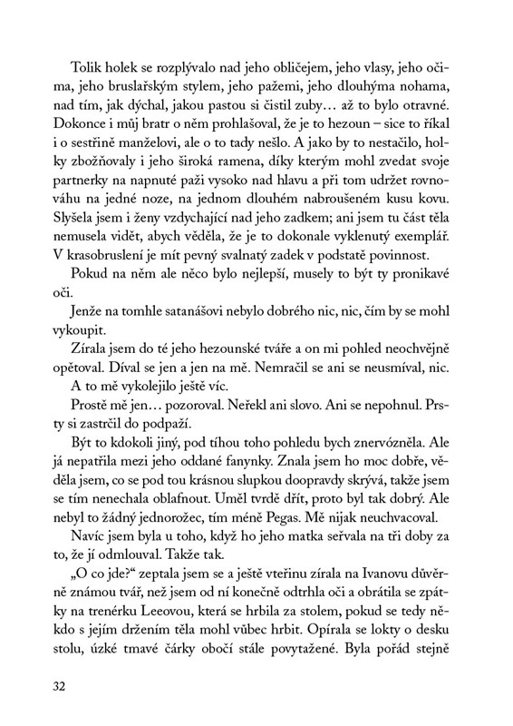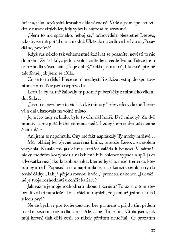 Ze všeho nejdřív bych chtěla pochválit naprosto skvělou atmosféru celé knihy. Autorka zvolila neobvyklé prostředí a výborně ho popsala. I když krasobruslení moc nerozumím, ráda na něj koukám a možná právě proto jsem si zrovna tuto knihu tak užívala.