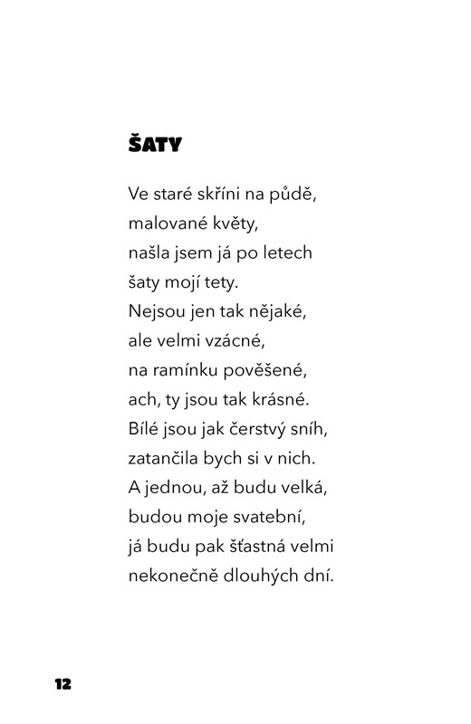 Autíčko, Dráček, Korálky, Podzim a mnohé další. Básničky o přírodě, ale také o kráse, která se ukrývá v maličkostech. A v obyčejných věcech, které máme všichni doma a občas nás ani nenapadne, že i ony si zaslouží své místo v poezii. Napsáno pro děti, zábavné i pro dospělé čtenáře.
