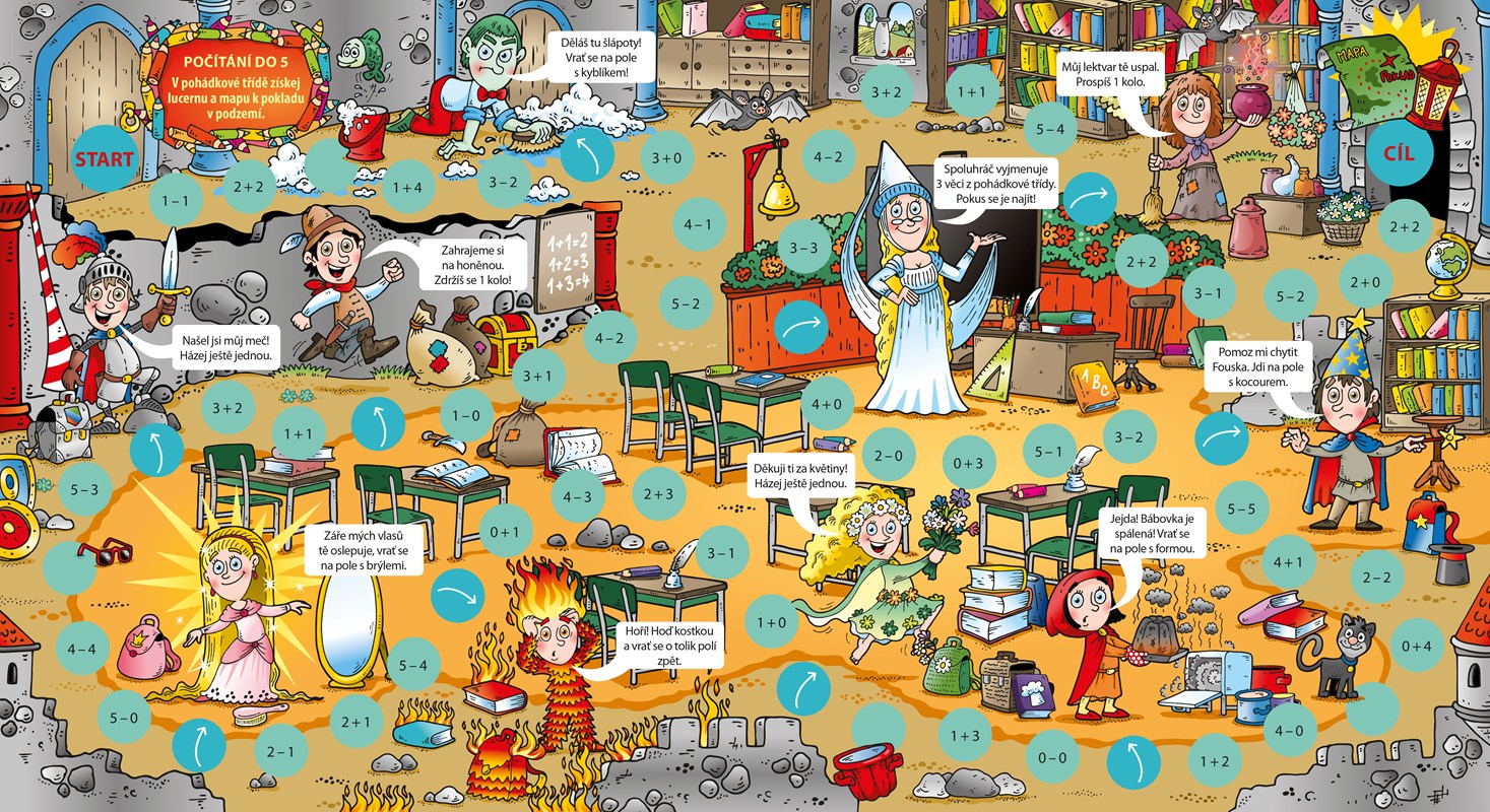 První plánek knihy je zaměřen na procvičení prvouky. Následující tři plánky se pak věnují počítání, a to nejprve do pěti, následně na dalším plánku do deseti a nakonec i do dvaceti. Děti, které se již seznámily s písmenky, mohou namísto rodičů číst krátké texty, skrze něž k hráči promlouvají pohádkové postavičky z herních plánků.