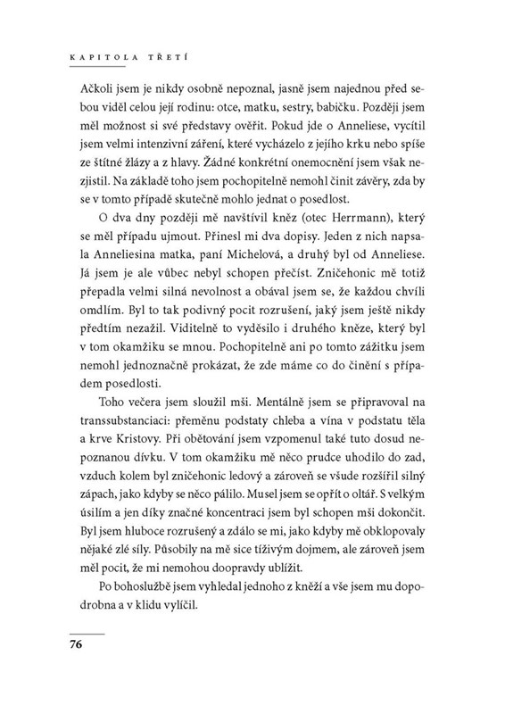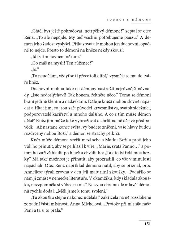 Vymítání ďábla – středověký rituál? Omyl. V 70. letech 20. století zemřela na následky několikanásobného exorcismu mladá žena, Němka Anneliese Michelová. Byla opravdu posedlá, jak tvrdili dva katoličtí faráři, nebo šlo o schizofreničku s psychotickými sklony, jak dívku diagnostikovali lékaři? Ani jedna z těchto teorií nebyla dosud jednoznačně prokázána či vyvrácena. Jedno však je jisté – Anneliese zemřela a její případ se dočkal celosvětové publicity. Knihu sepsala krátce po vynesení rozsudku jedna ze soudních expertek, antropoložka Felicitas D. Goodmanová. Přináší vlastní, velice střízlivý pohled na celou událost, podložený osobními rozhovory s faráři, rodiči a očitými svědky a studiem soudních spisů a nahrávek.
