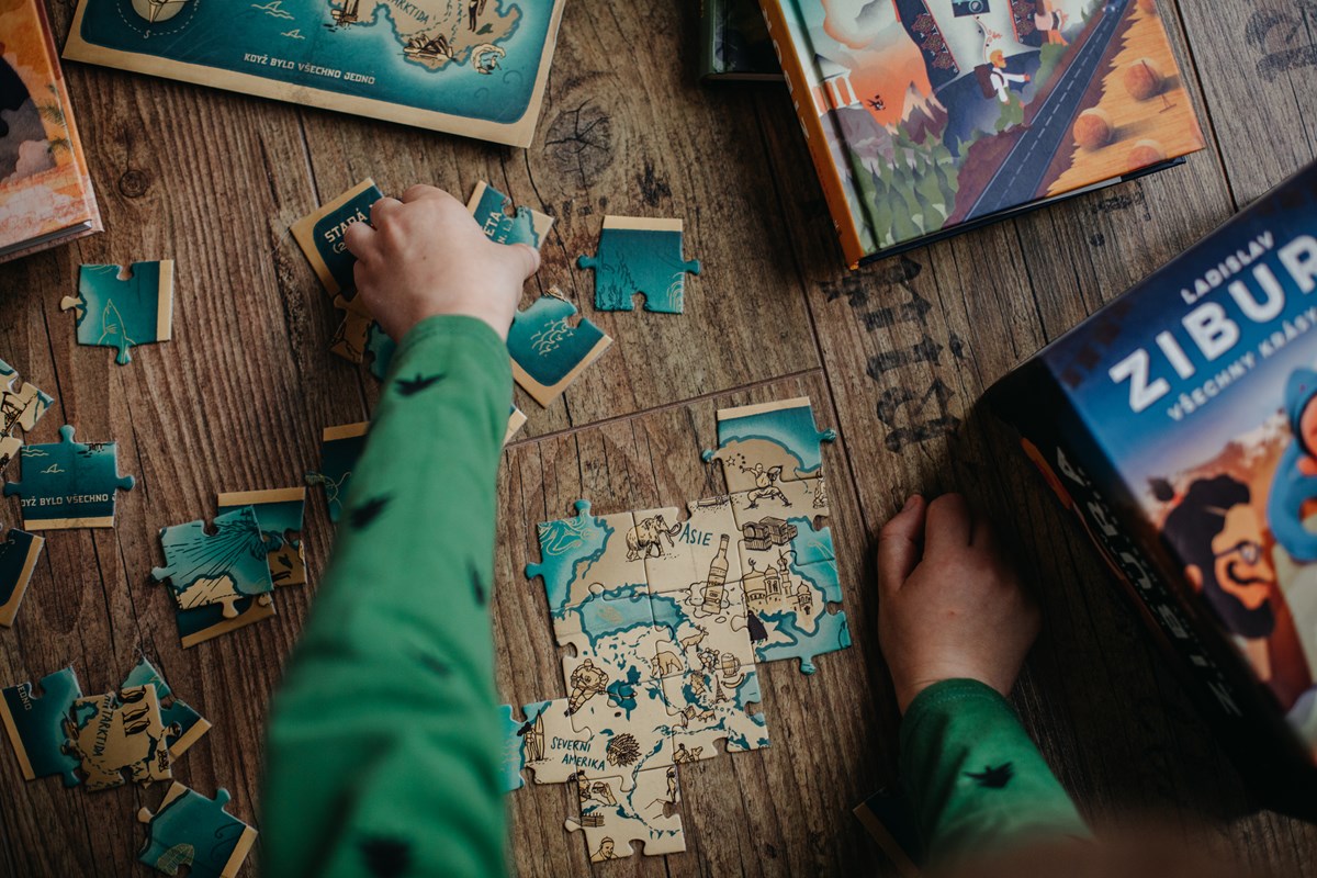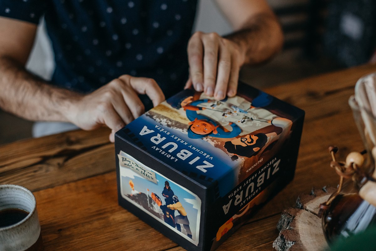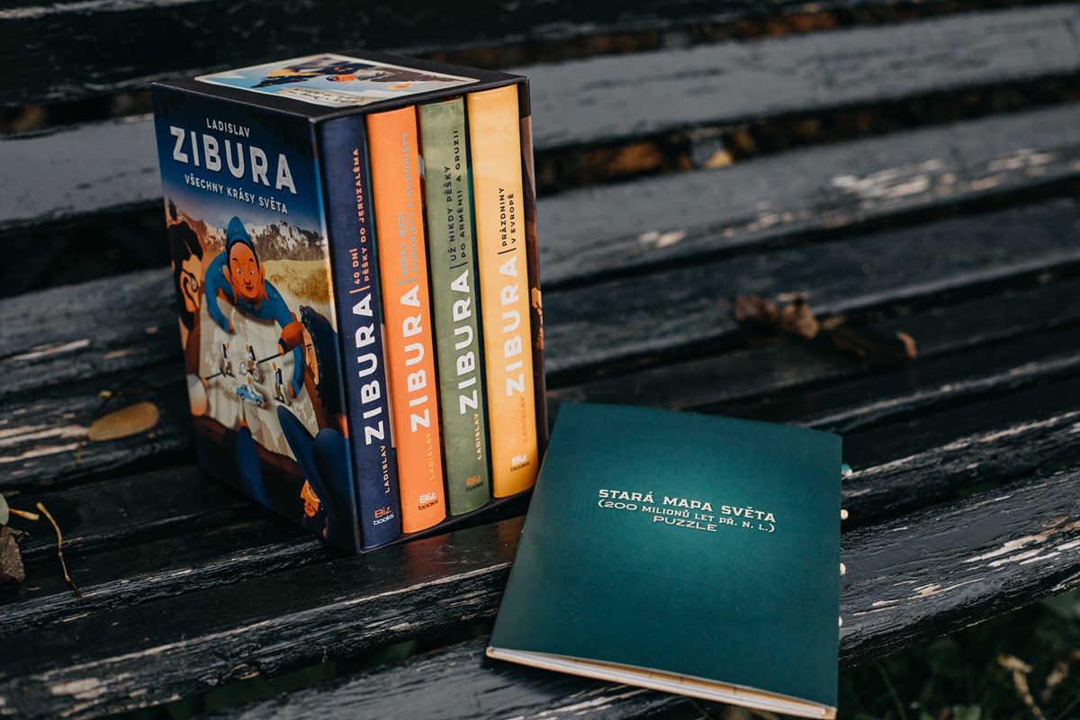 V dárkovém čtyřboxu najdete čtyři knížky – 40 dní pěšky do Jeruzaléma, Pěšky mezi buddhisty a komunisty, Už nikdy pěšky po Arménii a Gruzii, Prázdniny v Evropě plus dárek puzzle Mapa světa opět z dílny ilustrátorského dua Tomski & Polanski.