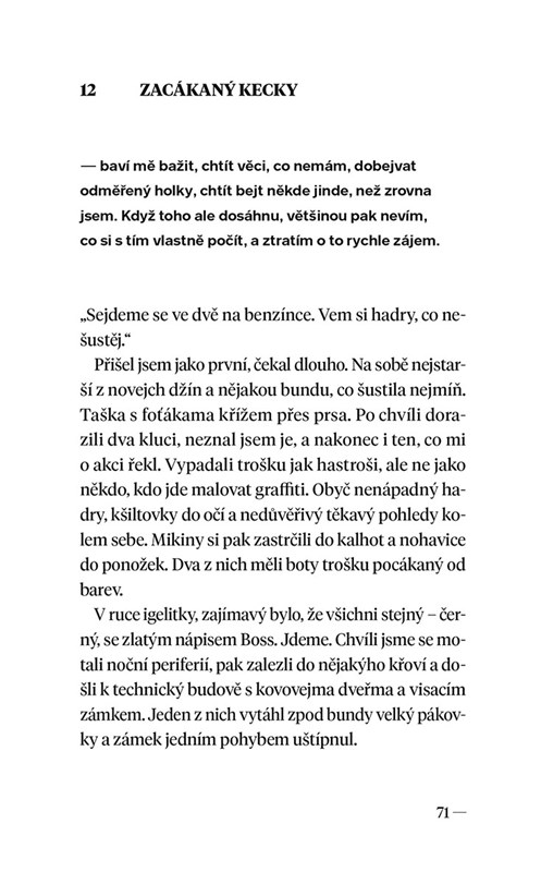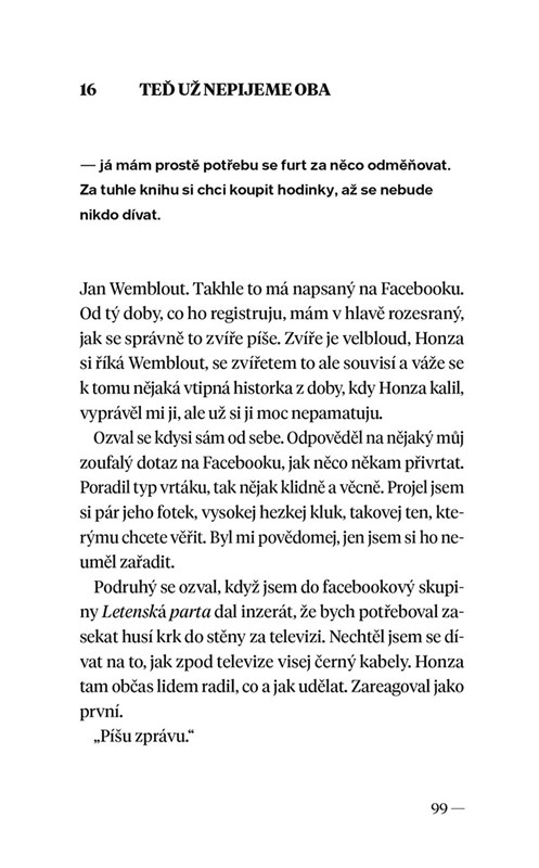 „Dojímá mě, když se starý páry držej za ruce, dojímaj mě babičky, co nechtěj v tramvaji pustit sednout, protože vystupujou už za dvě stanice, dojímaj mě psi, co soustředěně čekaj nepřivázaný na páníčka před krámem, děti s okluzorem a děti, co vlastním nákladem vydávaj knihy svých rodičů.