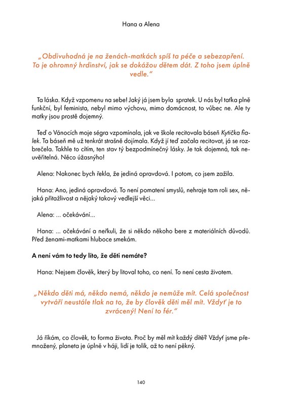 Existují knihy, které jsou důležitější než jiné. Ta, kterou napsala Martina Hynková Vrbová, mezi ty podstatné patří. Bezdětnost je pro většinovou společnost na jedné straně tak trochu nepochopitelná záležitost, na straně druhé je to tabu. Jde o téma, o kterém se nemluví. Martina o něm mluví. A dělá to takovým způsobem, že její kniha může být posilou bezdětným i mostem k pochopení mezi rodiči a nerodiči. Hodnota člověka totiž nespočívá v jeho dětech nebo dokonce v jeho práci, ale jen a jen v jeho osobnosti. Příběhy takových žen tato kniha ukazuje.