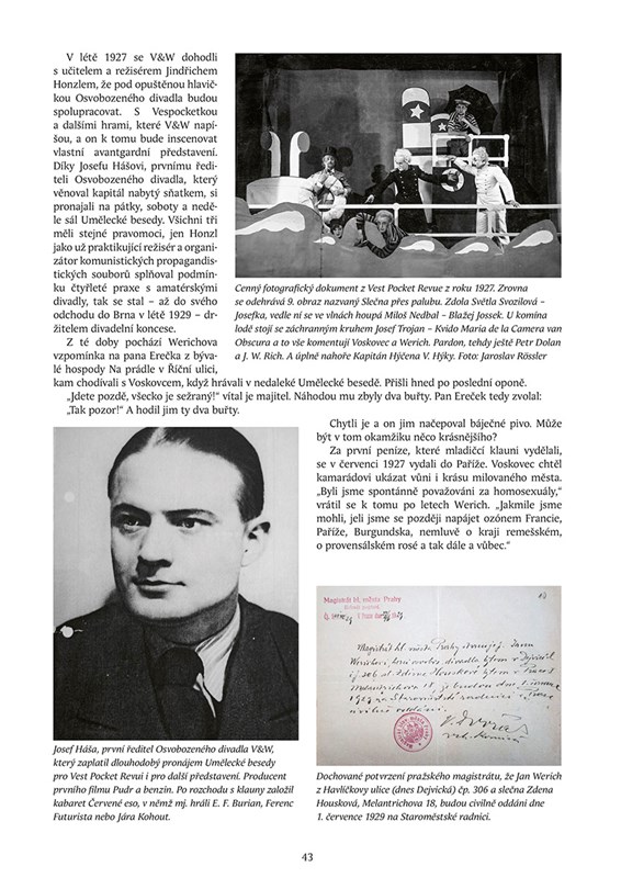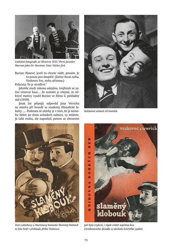 Osobnost Jiřího Voskovce je nerozlučně spjata s Janem Werichem – a naopak. Neopakovatelná dvojice komiků společnými silami vytvořila řadu kultovních scén a her. Ty si nyní můžete připomenout v publikaci mapující osobní i umělecký život obou mužů, a to včetně Voskovcovy kariéry v USA. Vydejte se prostřednictvím vzpomínek, úryvků korespondencí, reprodukcí plakátů a dosud neznámých fotografií prozkoumat svět V&W: poznáte ho v celé jeho šíři i pestrosti.