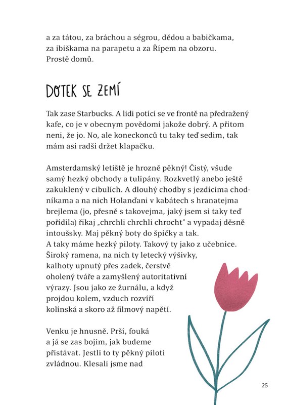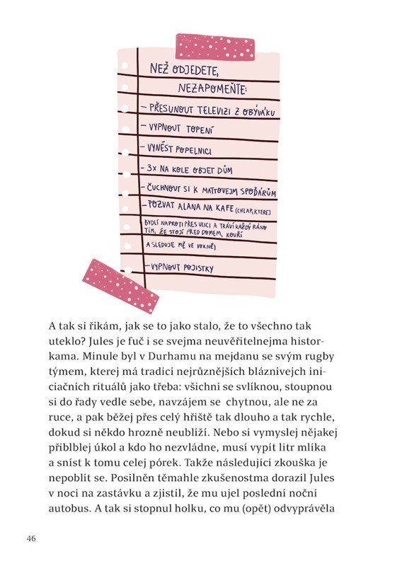 Scone s rozinkama a čaj o páté. S mlíkem samozřejmě. Pokoj velikosti vlakovýho kupé. Severní Anglie a to její zastřený nebe. Pak takový to klasický kafe z dineru v nevadský nicotě nebo Austrálie a tanečky vačic na furt ještě teplý kapotě. Prostě cizina. Ale v srdci stejně nejvíc Praha. Stejně jako mužský a ty doutnající krátery, co po sobě zanechaj, než jednou život začne konečně dávat trochu smysl.