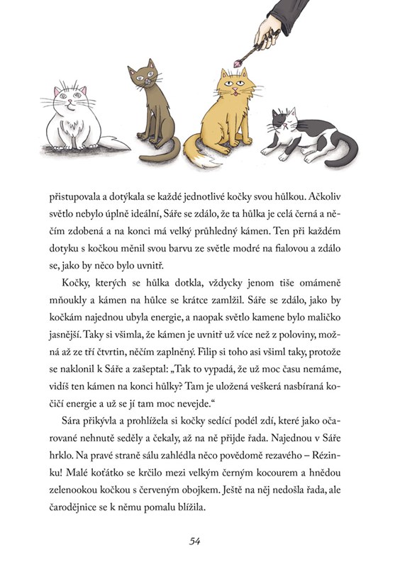 Jako první se ztratila Rézinka. Brzy po ní zmizely i další kočky… a pak se zase objevily. Sáře, Filipovi a Vojtovi nedá tato záhada spát, a tak se rozhodnou Rézinku sledovat. Zjistí, že všechny kočky z městečka jsou jakousi magickou silou přitahovány na jediné místo, kde pak záhadně mizí. Kdo je tam láká? Jak to dělá? A proč přicházejí zpět unavené?
