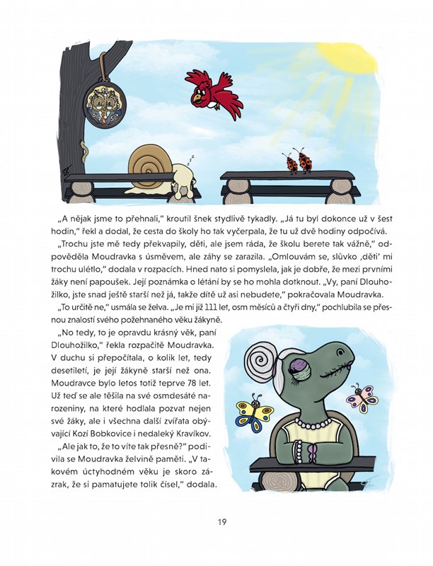 Víte, proč kočka vyniká v matematice a papouškovi nejde kotrmelec? Chcete zjistit, proč křeček krade svačiny a žížala málem propadne z kreslení? V lavicích Zvířecí školy sedává mnoho dalších žáků – třeba nesmělá želva, rošťácký jezevčík či roztržitá slepička. Každý v něčem pokulhává, v jiném zase vyniká a dohromady tvoří úžasně fungující partu.