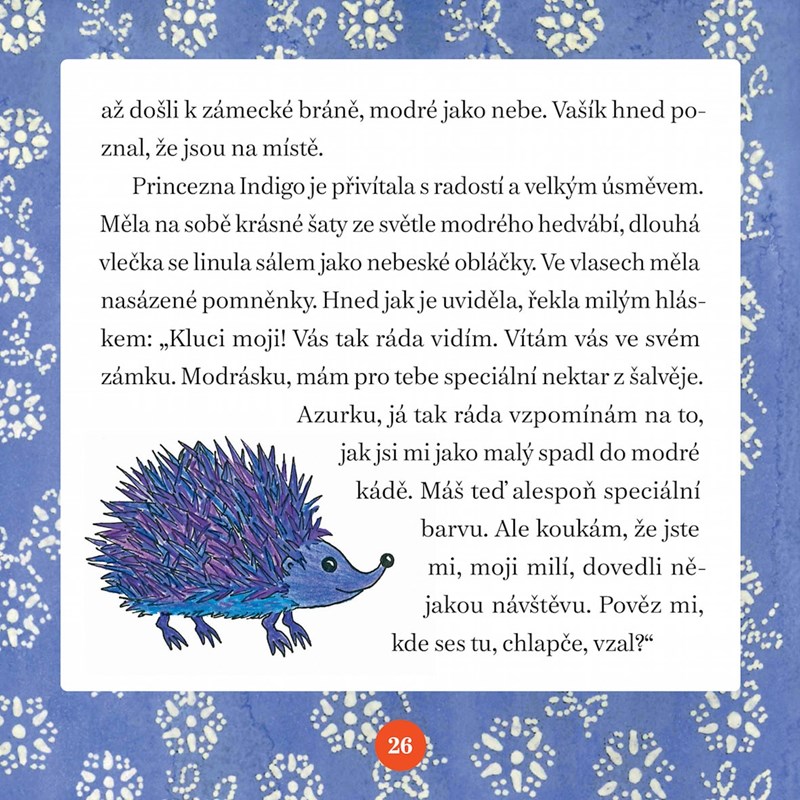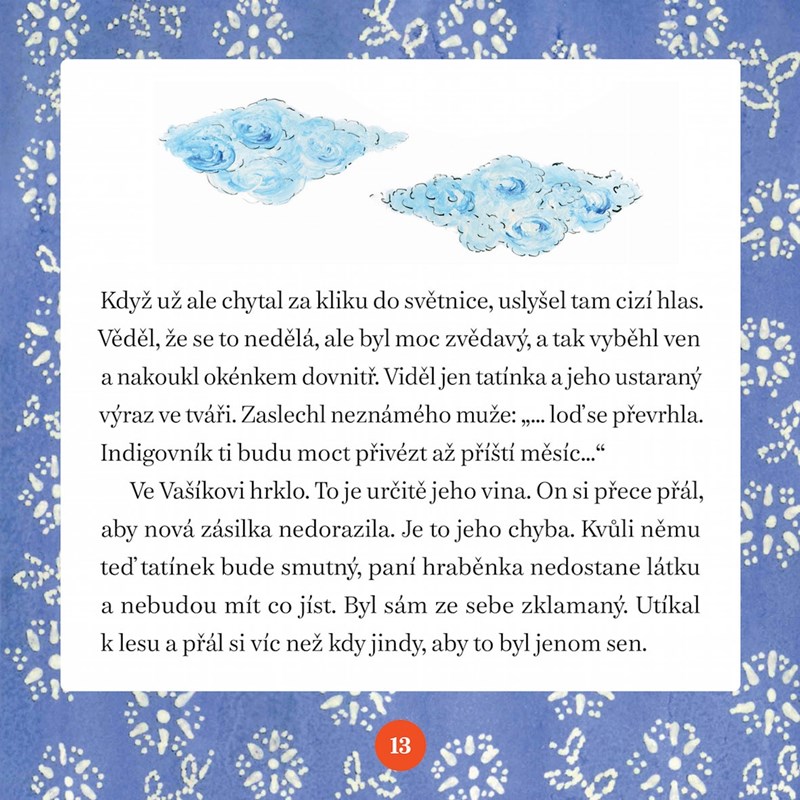 Vašíkův tatínek je barvíř. Jenže mu nedorazila dodávka indigovníku – a bez něj nebude žádný modrotisk! Co teď? Naštěstí se Vašík náhodou ocitne v modrobílém království, kde potká motýla modráska, modrého ježka Azura, vílu Rozárku a také princeznu Indigo. Ta mu přislíbí zásoby indigovníku, jen musí splnit tři úkoly. Podaří se to Vašíkovi? Jakou roli sehraje písnička jeho maminky? A co se v modrobílém království naučí o modrotisku i o tom, jak je důležité držet pospolu?