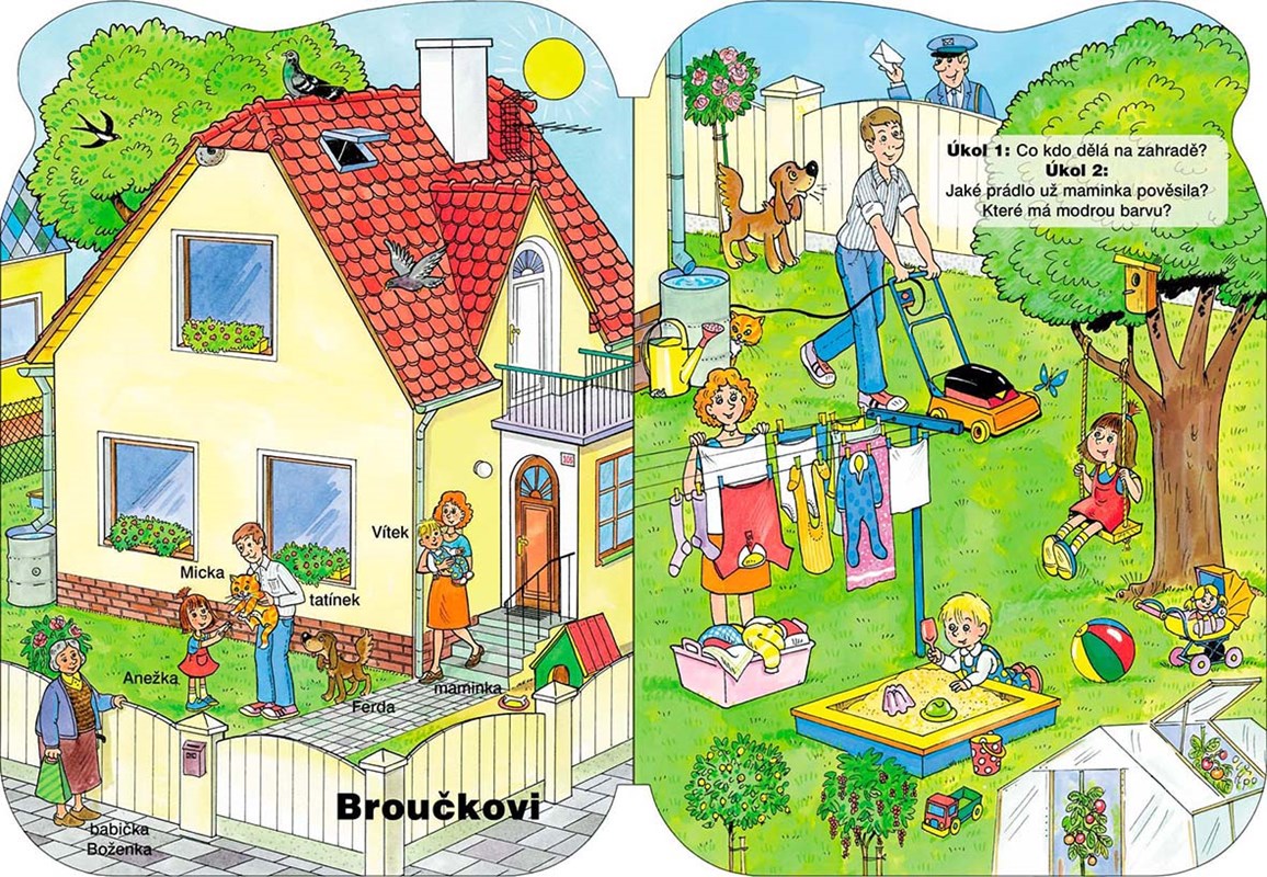 Velké leporelo pro nejmenší se zábavnými úkoly, zaměřenými především na rozvoj logického myšlení a představivosti. Na osmi celostránkových ilustracích se malí čtenáři seznámí s rodinou Broučkových, jejich domečkem i domácími mazlíčky.