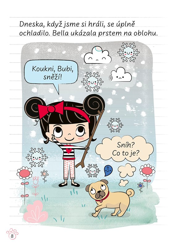 SNĚŽÍ! Bella je u vytržení, Bubi její nadšení ovšem nesdílí. Vždyť sníh studí, je mokrý a navíc to na něm pěkně klouže! A k tomu všemu se do vedlejšího domu přistěhoval kluk, který MÁ DĚSIVÉ, OBROVSKÉ ZVÍŘE. Naučí se Bubi mít rád sníh? A najde si nového kamaráda?