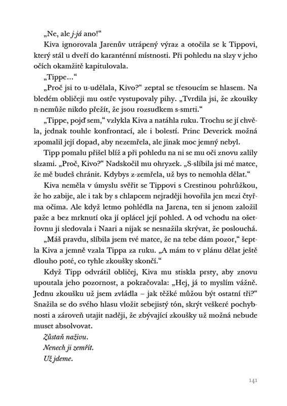 Ve stejné době dostane Kiva šifrovaný vzkaz od své rodiny: „Nenech ji zemřít. Už jdeme.“ Dívka si uvědomuje, že zkoušky by nemocnou královnu zabily, a tak se nabídne, že je podstoupí místo ní. Pokud uspěje, budou obě svobodné.