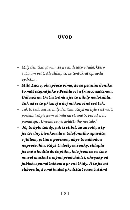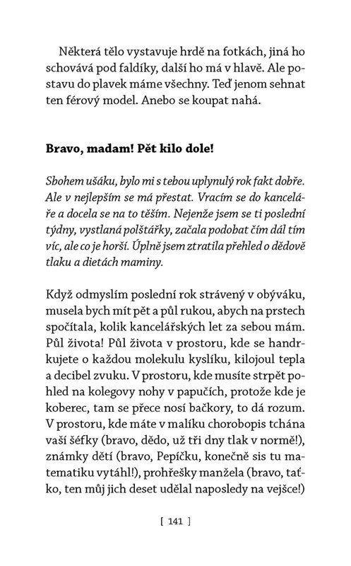 Na nic si nehraje, ale je hravá. Směje se, ale neposmívá. Trochu se jí horší zrak, ale to jí nebrání v nadhledu. Padesátka – žena, která ví své. Třeba že hledat správnou podprsenku je jako hledat správného chlapa. Přesně víte, co chcete, ale málokdy to sedne. Nebo že na nudistické pláži by měla ležet na zádech, protože zadky máme všechny stejné, ale předky je třeba ctít. A že když jí dojdou argumenty, není to tak zlé, jako když jí dojde toaletní papír. Přišla i na to, že hyperkorektnost ohrožuje nejen české Velikonoce, ale i světový mír. Fejetony, které pod názvem Očima padesátky píše publicistka Lucie Šilhová každý týden na serveru proženy.cz, nyní vycházejí knižně. S nadhledem, sarkasmem, vtipem a nadsázkou mapují jeden rok v životě ženy i české společnosti.