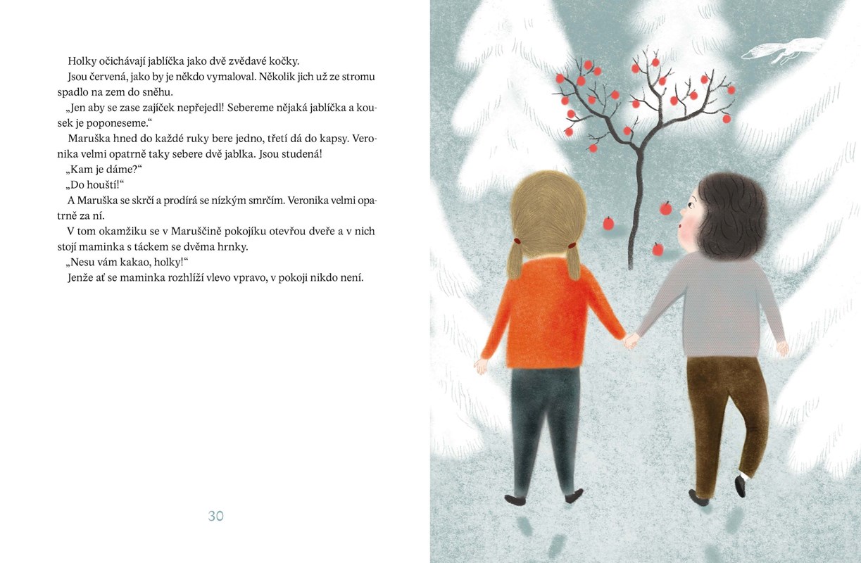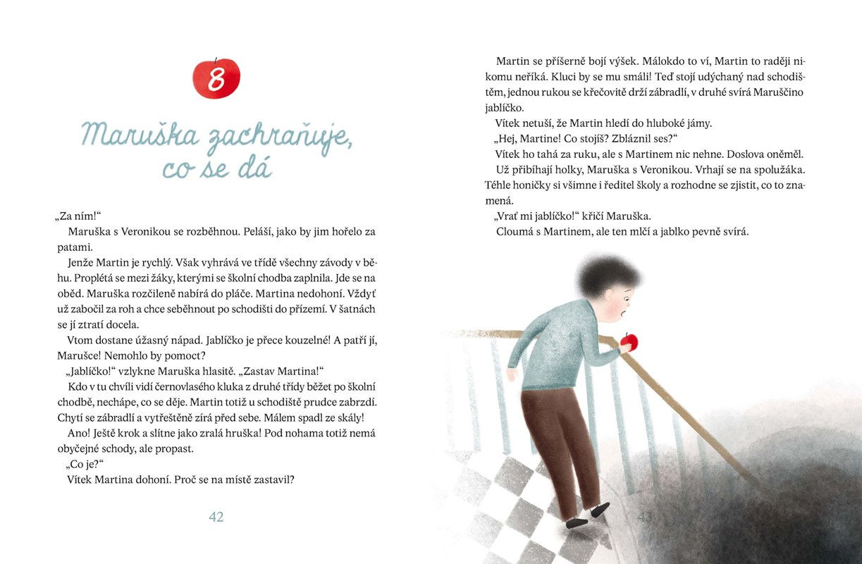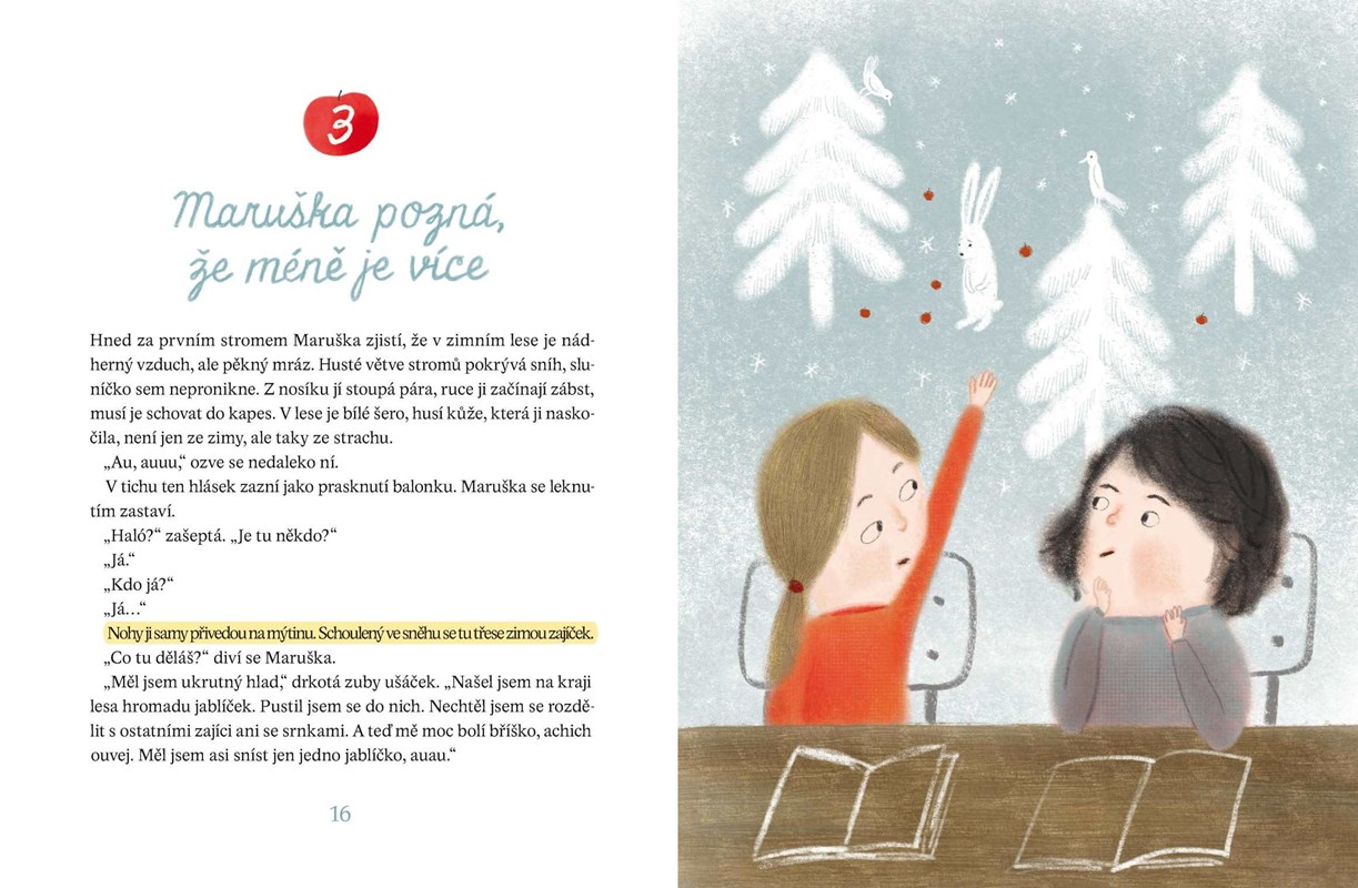 Není hned tak někdo s bohatou fantazií, jako je Maruška. Ráda si povídá s vymyšlenými postavami a ztrácí se v představách. Kamarádka Veronika to chce taky umět, a tak ji Maruška na výpravu do svého světa vezme s sebou. Po návratu je něco jinak – v Maruščině kapse zůstane červené jablíčko. Co je to za kouzlo?