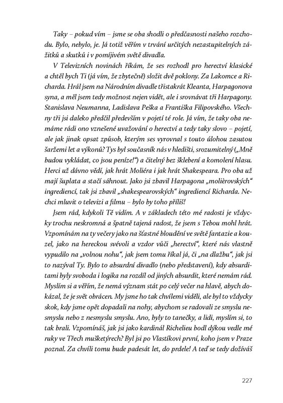 Od dětství v ulici Ve Smečkách přes první kontakty s divadlem, „souboje“ s E. F. Burianem, čtyři manželství a spoustu milostných vztahů po feldkuráta Katze, doktora Štrosmajera a osudové onemocnění.