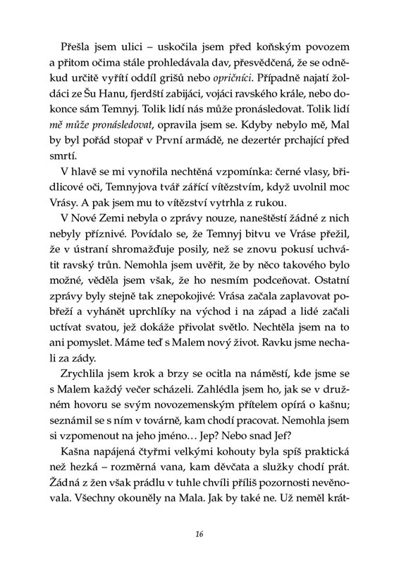 Z obyčejné dívky Aliny Starkové se stala světlonoška. Mnozí k ní upínají své naděje – vždyť jen ona jediná dokáže zničit Vrásu stínu, jež odedávna sužuje zemi. Jenže cena, kterou za to platí, je vysoká. Touží žít někde v ústraní s milovaným Malem po boku, místo toho stále prchá a skrývá se před minulostí.
