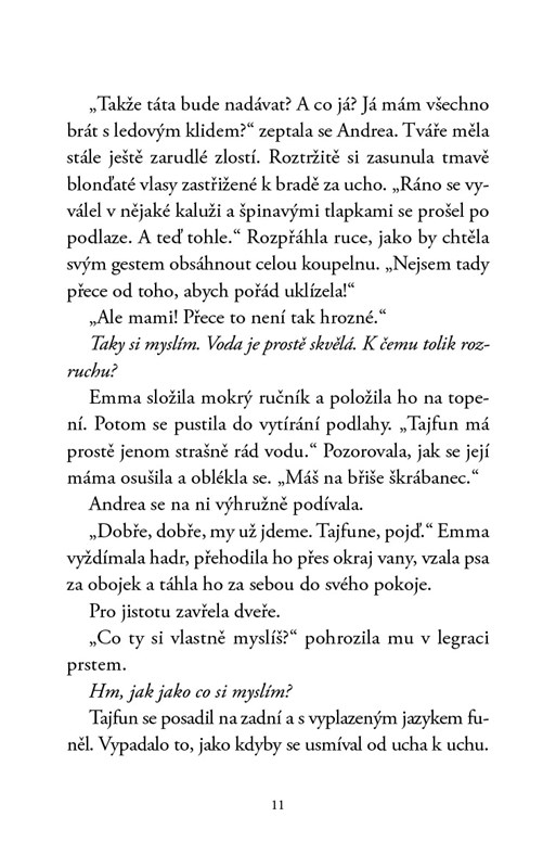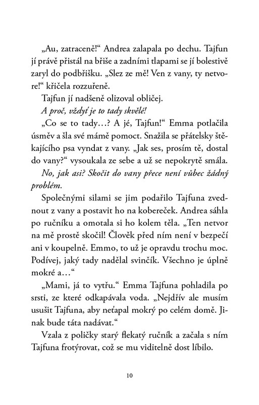 Rozkošného křížence, kterého rodiče přivedli z útulku, si Tommi a Emma ihned zamilují. Tajfun zbožňuje louže, rybníčky, zkrátka vodu. Čest svému jménu dělá spolehlivě – kam vběhne, tam způsobí zmatky a chaos.