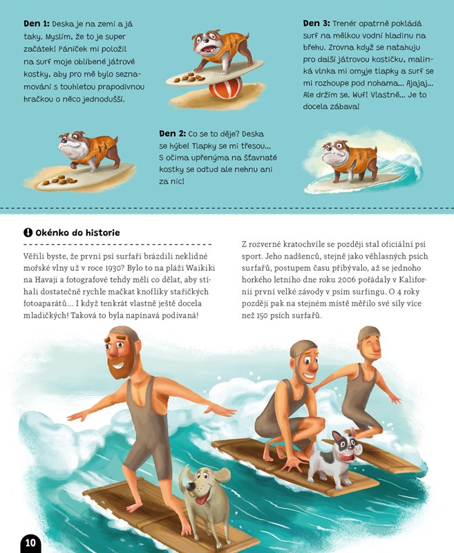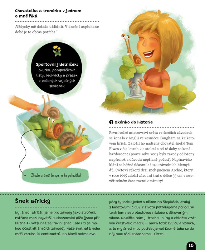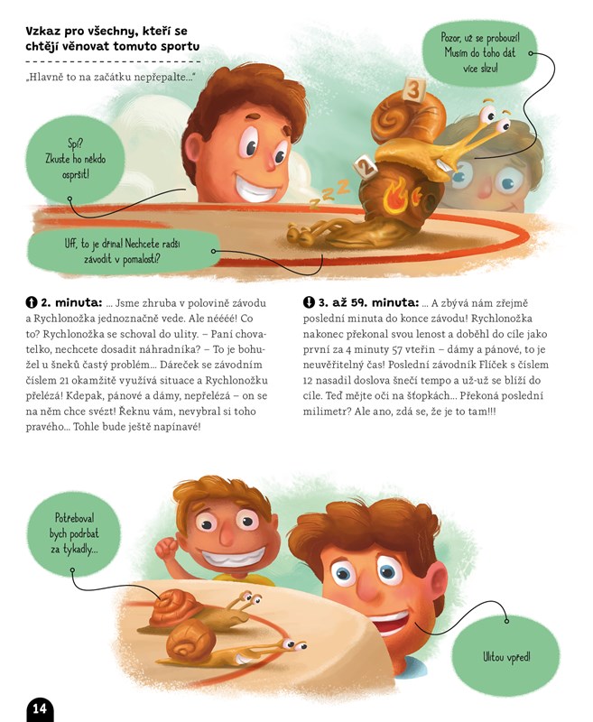 Připravit ke startu, pozor, teď! Milí diváci, vítáme vás na přehlídce známých i opravdu neobvyklých sportů se zvířecími mazlíčky. Na trati číslo 1 se vám představí smělý hlemýžď Rychlonožka, který bude usilovat o prvenství ve šnečích závodech. Na trati číslo 2 už se na vás těší plachá Sněženka, králičice, která vám předvede, jak se správně skáče králičí hop. Oslík BonBon na trati č. 3 vám zase vysvětlí, kdo koho nosí na zádech při oslím maratonu. Oslík člověka nebo člověk oslíka? Nenechte si ujít spoustu dalších svéhlavých, horlivých, unuděných i učenlivých sympaťáků: prozradí vám třeba, jak se dělá sloní smeč nebo jak může líná kočka docílit úpravy pravidel v kočičím agility. Husky Hafky vás sveze se psím spřežením a s černým hřebcem Fantomem poběžíte doslova s větrem o závod! Pozor, pozor: A kdyby vás náhodou při čtení trochu bolelo za krkem, zacvičte si v každé kapitole spolu s našimi závodníky.