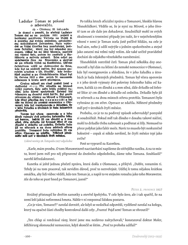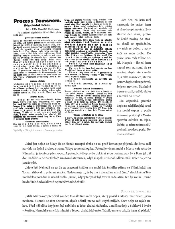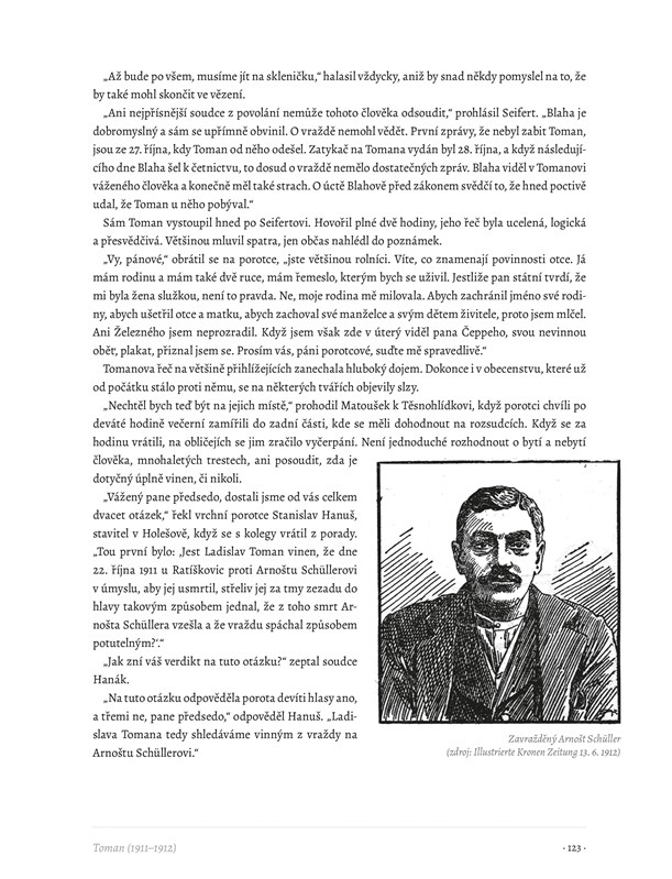 Na titulní straně: 1. Statkář Ladislav Toman podezřelý z vraždy na Arnoštu Schüllerovi 2. Eskorta zatčeného Tomana na nádraží v Uherském Hradišti 3. Stolařský pomocník Arnošt Schüller, oběť Tomanova zločinu 4. Rekonstruovaná tvář zavražděného Arnošta Schüllera v hodonínské márnici