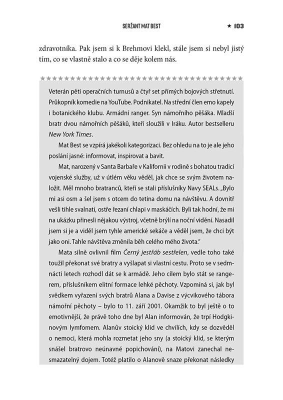 Od oblohy nad Afghánistánem přes Středozemní moře až po nebezpečné ulice Iráku, tam všude tito stateční muži a ženy plnili své vojenské mise. Co však spojuje hrdinné bojovníky oceněné mnoha vyznamenáními? Kde čerpali inspiraci pro službu vlasti? Co pro ně znamená osobní oběť? A čemu se od nich můžeme naučit? Odpovědi na tyto klíčové otázky předkládá Pete Hegseth v upřímných rozhovorech s veterány Navy Seals, námořní pěchoty, letectva a námořnictva. Jejich osobní příběhy poskytují ucelený a nepřikrášlený obraz o válce, vedení lidí a překonání osobních útrap i těžkostí.