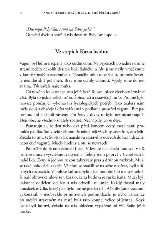 „NÁŠ VLAK V NOCI ZASTAVIL A ZHRUBA HODINU STÁL V POLI. NAJEDNOU SE K NĚMU ZE VŠECH STRAN ZAČALI PŘIBLIŽOVAT OBYVATELÉ BLÍZKÝCH KOLCHOZŮ. MYSLELI JSME, ŽE NÁM TI DOBŘÍ LIDÉ NESOU NĚCO K JÍDLU. NAOPAK. ZAČALI NÁS ÚPĚNLIVĚ PROSIT O NĚJAKÉ POTRAVINY. PROSILI A NAŘÍKALI. ZROVNA BYLY PRAVOSLAVNÉ VELIKONOCE A ONI UMÍRALI HLADY. ‚BOŽE!‘ POMYSLELA JSEM SI VYDĚŠENĚ. ‚KDE JSME SE TO OCITLI? CO NÁS ČEKÁ?‘“