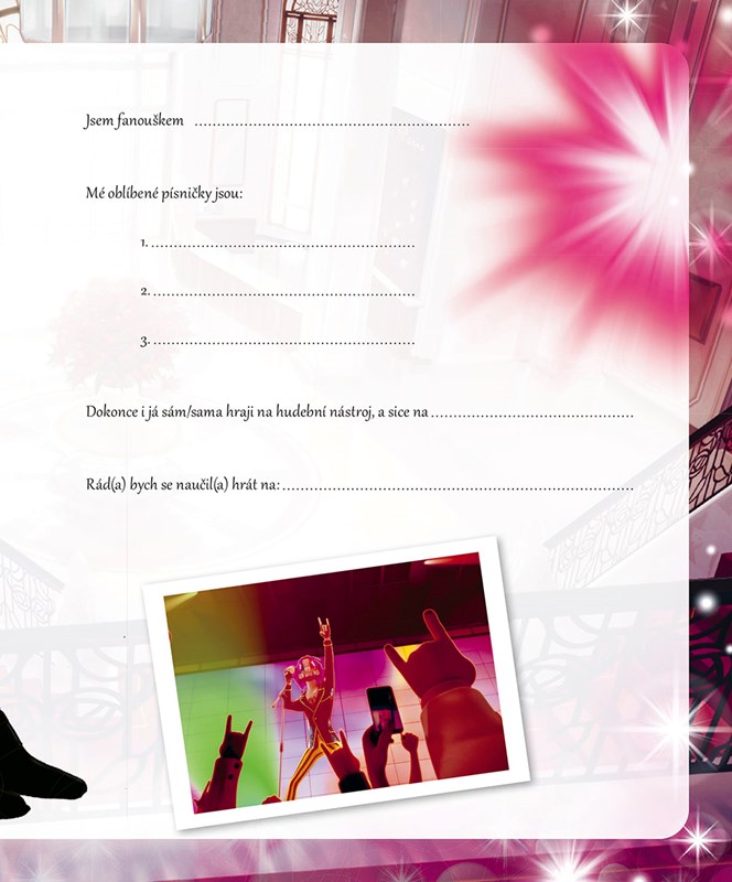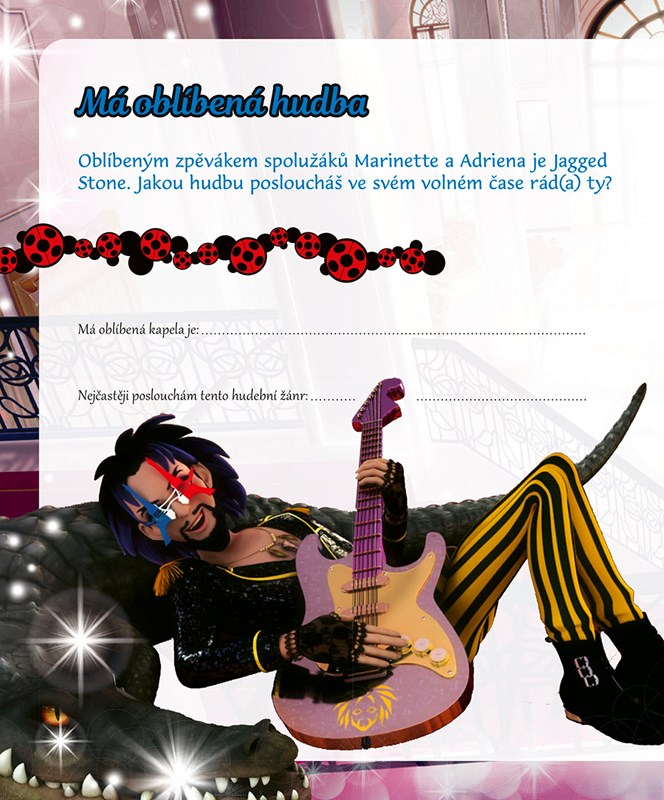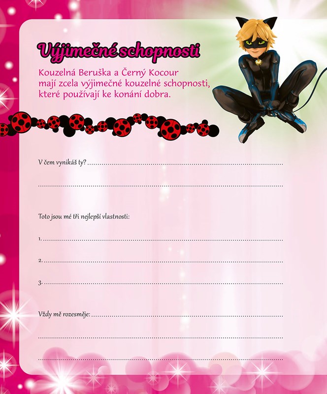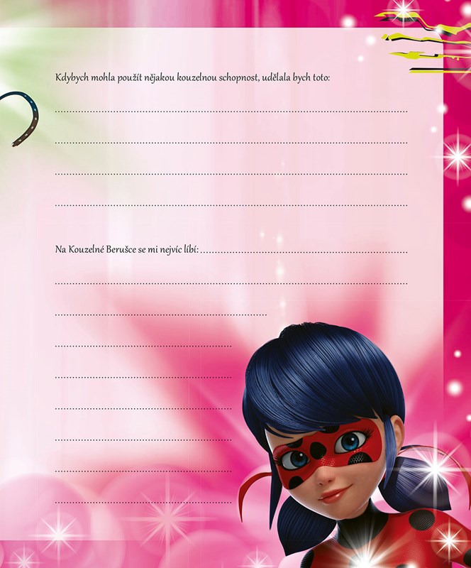 V tomto zápisníku najdeš prostor pro všechny své myšlenky, tajemství a čarovné okamžiky, které chceš sdílet s Kouzelnou Beruškou a Černým Kocourem. Můžeš si sem poznamenat, čím se právě zaobíráš, co tě baví a v čem zvlášť vynikáš, lepit fotky nejlepších kamarádů, nadšeně povyprávět o své oblíbené hudbě, popsat své koníčky a dělat si poznámky o tom, co jsi zažil(a).
