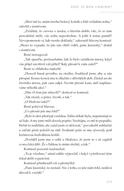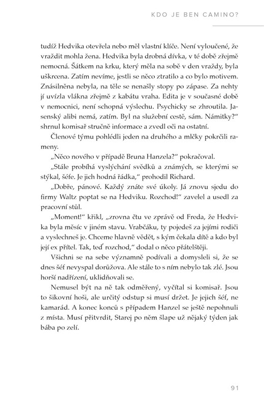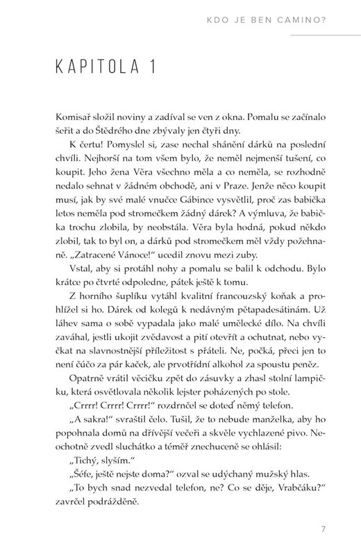 Charismatický komisař s osobitým smyslem pro humor a ironii Norbert Tichý vyšetřuje naráz hned dvě vraždy. Dostane na starost případ mrtvoly muže nalezené v lesíku poblíž Prahy těsně před Vánocemi a posléze uškrcené dívky. Vše komplikuje vzplanutí komisařových citů k hlavní podezřelé Editě Jasenské, bohaté dědičce a majitelce firmy. Tahle dlouhonohá krásná čarodějka ho svým půvabem, noblesou a záhadností na krátkou dobu uhrane. Její manželský vztah k mladšímu muži Renému, úspěšnému a sebevědomému řediteli firmy, není zrovna jednoduchý a idylický, i když se to tak na první pohled může zdát. Jak spolu obě vraždy souvisí a jaká tajemství celou dobu skrývají jednotliví protagonisté? A kdo je tajemný Ben Camino? To všechno čtenář postupně odhalí.