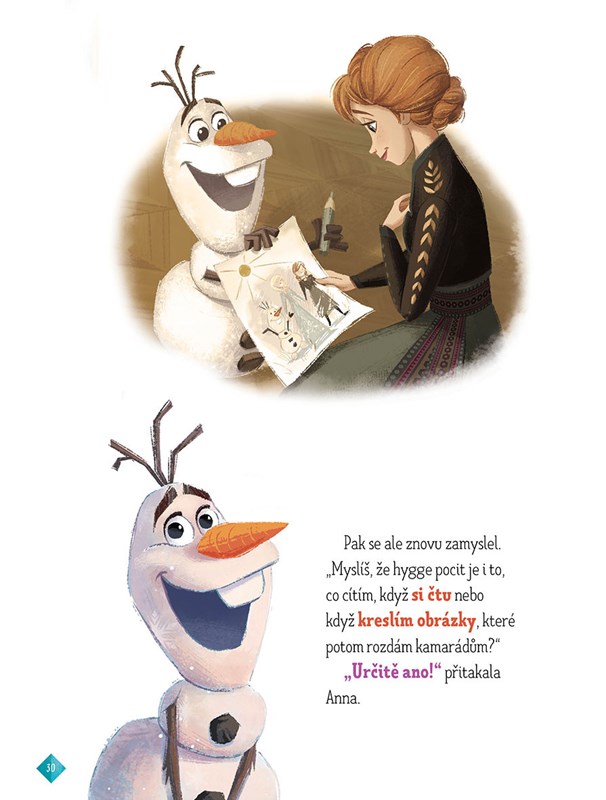 Olaf si v knihovně vypůjčil knihu s tajuplným názvem Hygge. Copak to znamená? Kamarádi to vědí, je to pohoda a pocit štěstí. Jeden po druhém pak ostatním sdělují, kdy takovou radost zažívají. Ve druhé části pak na vás čeká šest milých příběhů, které si kamarádi vypravují večer u krbu. Většina z nich je o tajuplných a bájných stvořeních, které najdete jen v Ledovém království!