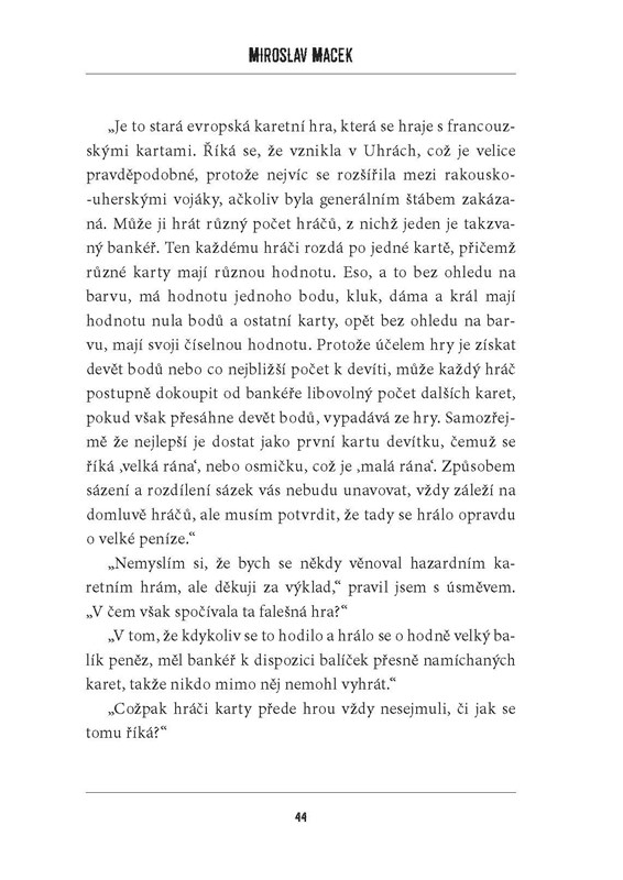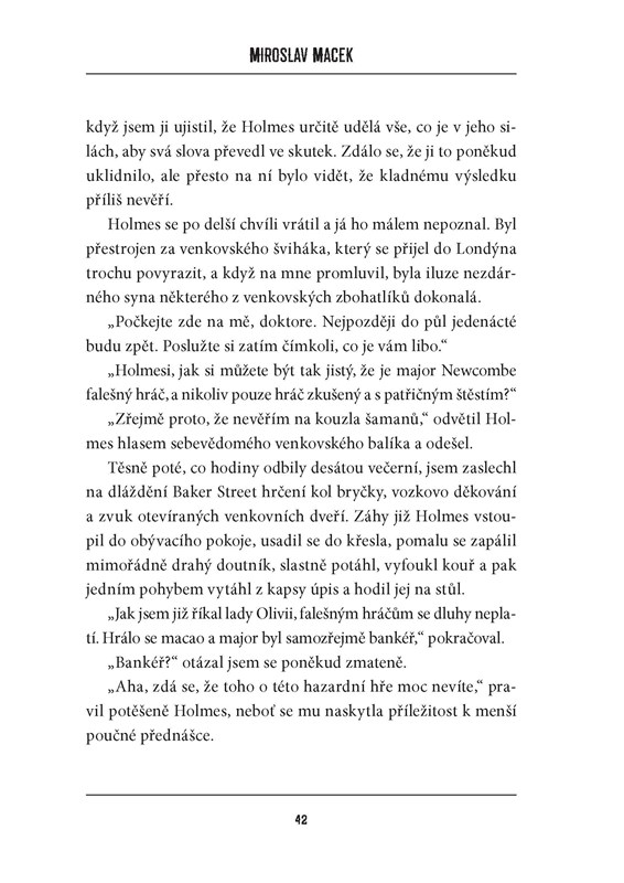 Miroslav Macek tentokrát zúročuje nejen svou aktivní zálibu v klasické literatuře, ale i vášeň pro detektivní žánr. Troufáme si tvrdit, že kniha nemá žádná hluchá místa, je to text opravdu holmesovský, ve srovnání s A. C. Doylem naprosto obstojí – ba dokonce, jsa psán původním jazykem autora je mnohdy i jemnější než byť i skvělý překlad.