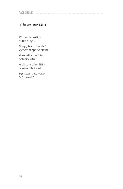 Pravidelné verše a hravé rýmy jsou základní surovinou sbírky básní a básniček psaných jen tak, pro radost. Důležitými ingrediencemi jsou nadhled, (sebe)ironie a humor. Pro dochucení nechybí ani hrst lásky či špetka deprese. Autor není žádný avantgardní michelinský šéfkuchař, ale samouk, který co si (vy)sní, to si také uvaří. Výsledkem proto není těžce stravitelný gastronomický experiment, ale docela obyčejná domácí laskomina.