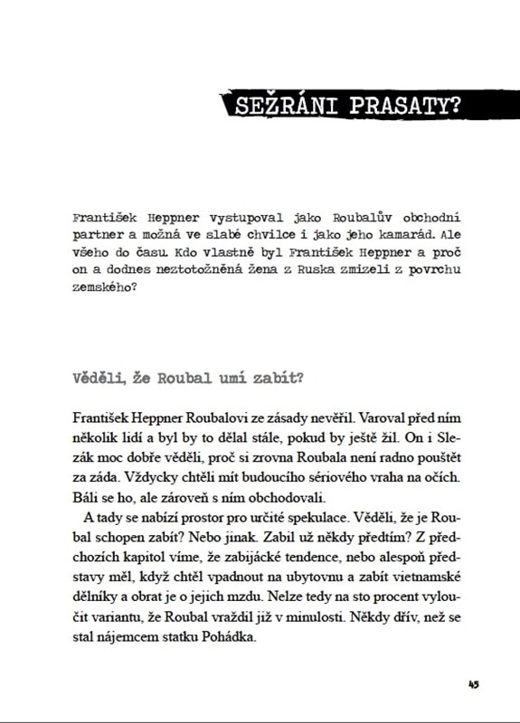 Není tělo – není vražda! Platnost této teorie zajistila Ivanu Roubalovi svého času svobodu pohybu i veškeré činnosti. Bohužel… Později byl pravomocně odsouzený za pět prokázaných vražd, mrtvých měl ale podle všeho na svědomí více. Kde jsou těla? Sežrána prasaty na jeho statku….? To asi těžko… Kde je majetek jeho obětí? A proč měl ve sklepení své usedlosti mučírnu? Otázky se množí – odpovědi na ně hledá badatel a spisovatel v jedné osobě, Ondřej Krotil. Prošel stovky stran policejních protokolů, výpovědí svědků a úředních záznamů. Na leccos nového přišel. Jste zvědaví, čím nás Ivan Roubal, nejznámější český sériový vrah, pár let po své smrti ještě může překvapit?! Čtěte…