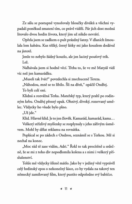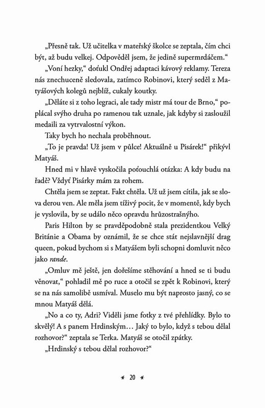 Skoro každá holka se někdy zamilovala do svého nejlepšího kamaráda, herce nebo zadaného kluka. Matyáš splňuje všechny body, včetně toho, že pro něj Adriana ztratila hlavu. Navíc jí osud hází do cesty jednu absurdní situaci za druhou. Má pocit, že žije v telenovele a nezbývá jí nic jiného, než se obrnit pořádnou dávkou sarkasmu, aby se z nejasných signálů nezbláznila. Jak to dopadne, když se na vás herecký idol nedívá z plakátu, ale přes roh stolu?