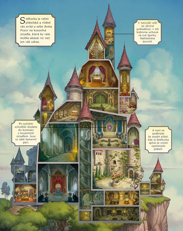 Ariel, Růženka, Bella, Popelka, Jasmína, Merida, Mulan, Locika a Sněhurka vás zvou do zámků, hradů a paláců, aby vám ukázaly své domovy a v nich honosné sály, útulné komnaty, praktické kuchyně i skrytá sklepení či tajemné půdy. Uvidíte, kdo všechno v zámcích s princeznami žije, a znovu si připomenete jejich nezapomenutelné příběhy. Pojďte dál, kouzelný svět ožívá!